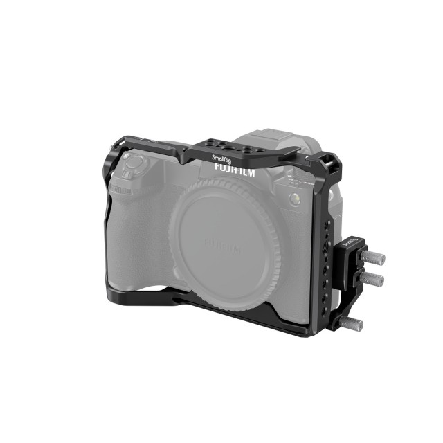 Klietka SmallRig a svorka na káble pre fotoaparát FUJIFILM GFX100S/GFX50S II 3715 je navrhnutá tak, aby chránila fotoaparát, poskytovala rôzne montážne body pre príslušenstvo a zabezpečovala stabilný prenos signálu. Zabezpečenie fotoaparátu pomocou jednej skrutky 1/4"-20 v spodnej časti a pravého otvoru na ramenný popruh, aby sa zabránilo vychýleniu. Klietka zachováva prístup k tlačidlám, slotom na karty, portom, dvierkam batérie a výklopnému displeju. Je vybavená otvormi 1/4"-20, polohovacími otvormi ARRI 3/8"-16, lištou NATO na upevnenie hornej rukoväte 2165, bočnej rukoväte 2093, HSS2426, 2187, ako aj držiaka monitora 2903 a 2904; dodáva sa s cold shoe na hornej strane na upevnenie mikrofónu, svetla LED, spúšte blesku atď. Rýchloupínacia doštička Arca-Swiss je vhodná pre statív 3257 na rýchle prepínanie medzi snímaním zo statívu a z ruky; otvor so závitom 1/4"-20 v spodnej časti je vhodný pre rýchloupínaciu doštičku (podložku) stabilizátora DJI RS 2/RSC 2 stabilizátorov DJI RS 2/RSC 2 na snímanie so stabilizátorom. Súčasťou balenia je prístupný kľúč na montáž alebo demontáž skrutiek. Okrem toho sa klietka dodáva so svorkou na kábel HDMI a Type-C, upevnenou pomocou skrutky s gombíkom, aby sa zabránilo odpojeniu signálu.