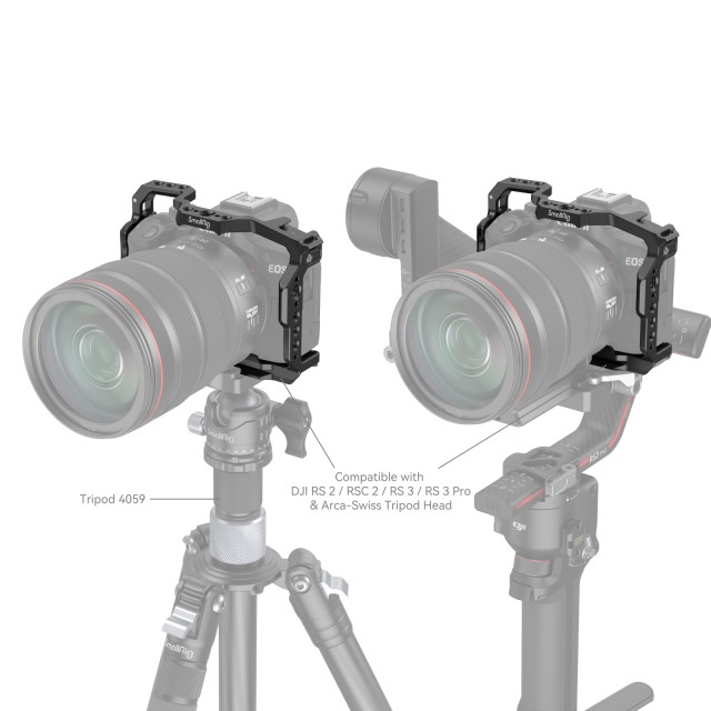 Klietka SmallRig pre Canon EOS R50 4214 je určená na ochranu fotoaparátu a pripevnenie príslušenstva. Klietka sa uzamyká pomocou jednej spodnej skrutky 1/4"-20 a dvoch bočných uzamykacích adaptérov, je vybavená gumovými podložkami, ktoré zabraňujú poškriabaniu, a poskytuje úplný prístup k tlačidlám, slotom na karty, výklopnému displeju a batérii. Medzi jej úchytmi na príslušenstvo sú otvory so závitom 1/4"-20, otvory so závitom 3/8"-16 a polohovacie otvory ARRI 3/8"-16, ktoré podporujú hornú rukoväť 3765, bočnú rukoväť 2093C, držiak na monitor 2903B a magické rameno 3875;
