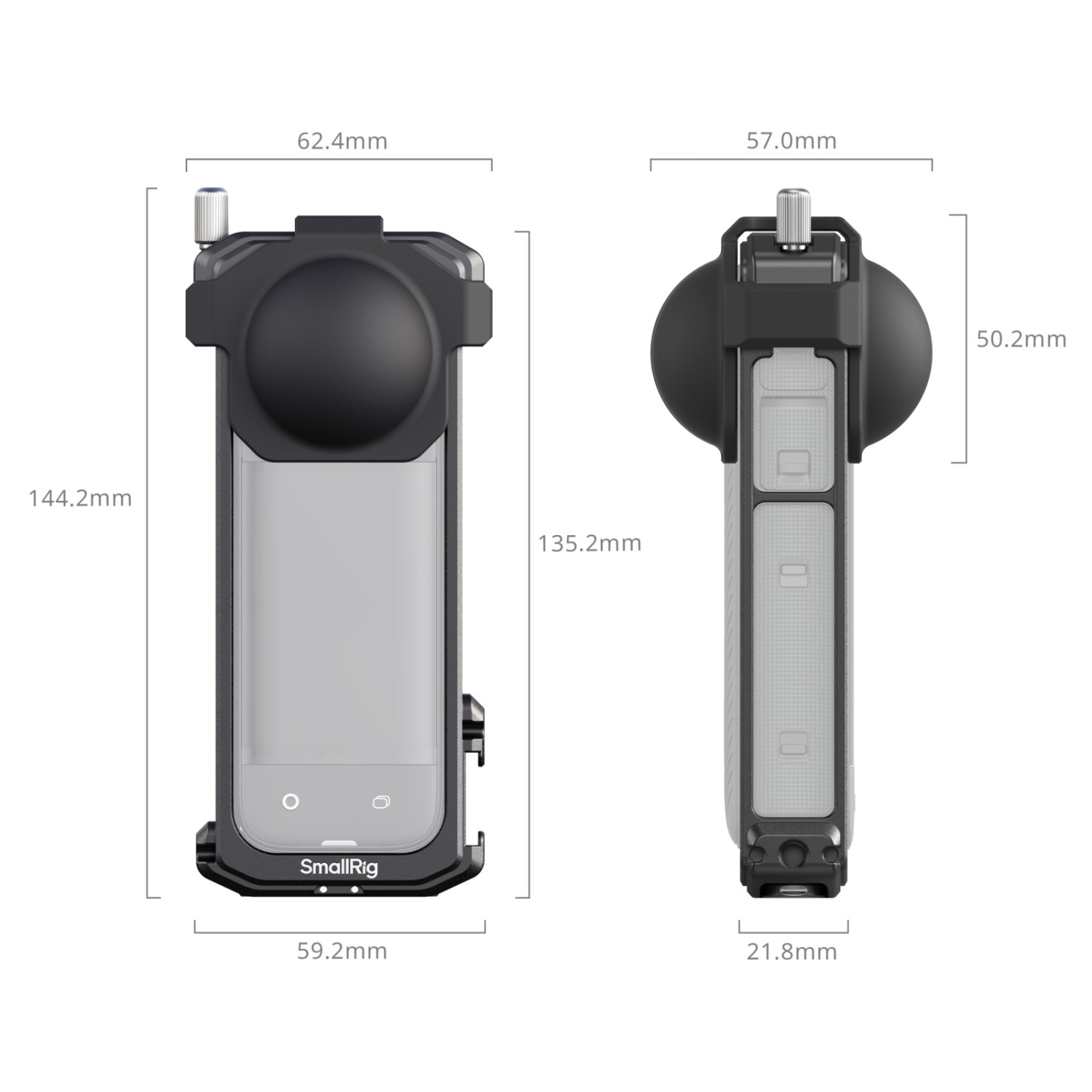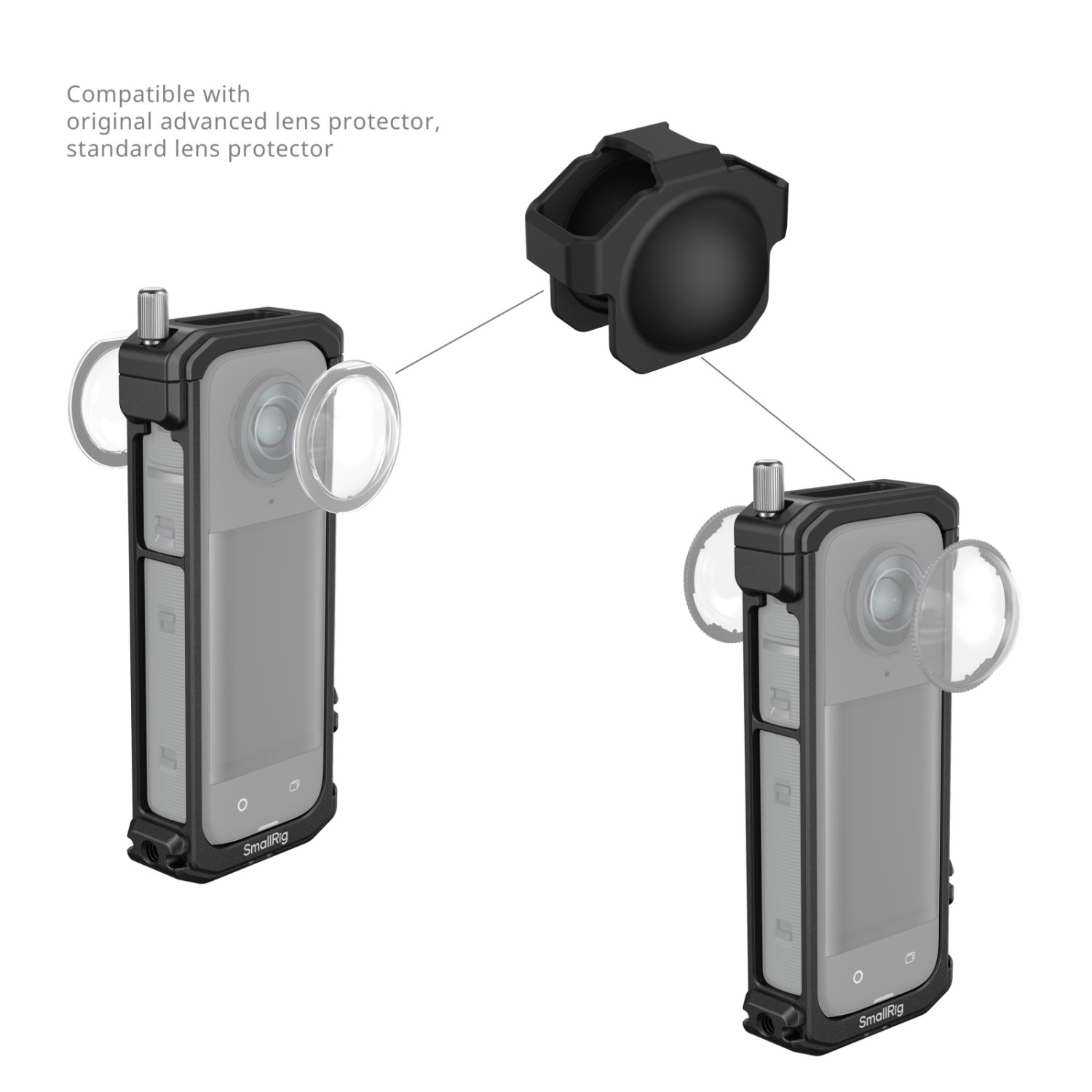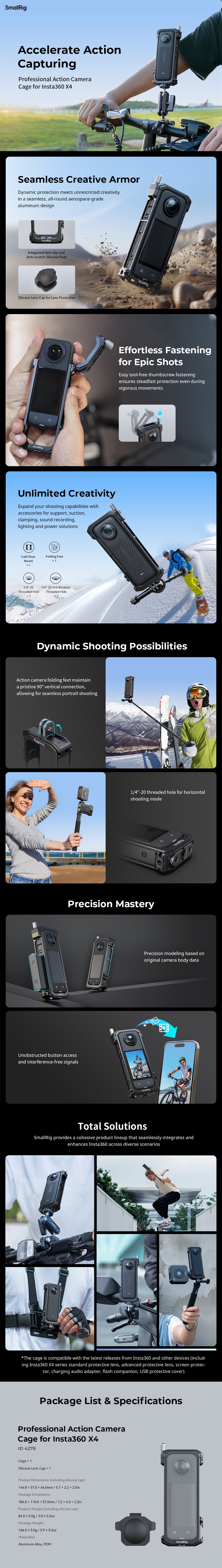 Klietka SmallRig pre Insta360 X4 4278 poskytuje ochranu kamery a rôzne rozširujúce príslušenstvo rozhrania pre väčšie pohodlie počas snímania. Vďaka konštrukcii s bočnou štrbinou klietka poskytuje voľný prístup k dvierkam batérie, čo umožňuje rýchlu výmenu batérie bez nutnosti demontáže klietky. Klietka tesne prilieha k akčnej kamere, pričom vnútorné silikónové podložky zabraňujú poškriabaniu tela kamery. Kamera sa do klietky umiestňuje zhora a upevňuje sa pomocou skrutky s palcom, pričom na inštaláciu nie sú potrebné žiadne nástroje. Klietka je vybavená držiakom na studenú päticu a otvorom so závitom 1/4"-20 proti skrúteniu na boku na pripevnenie mikrofónov, LED videosvetla a iného fotografického príslušenstva. Spodné rozhranie akčného fotoaparátu možno zložiť na uskladnenie a je tiež vybavené otvorom so závitom 1/4"-20 na priame upevnenie statívov so skrutkou 1/4"-20, selfie tyčí(4758) a ďalších zariadení. Dodáva sa so silikónovou krytkou objektívu na ochranu objektívu počas skladovania.