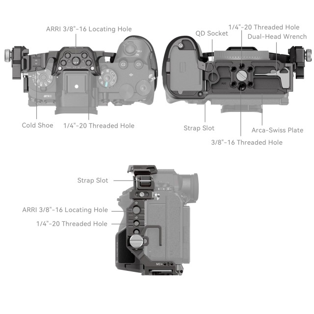 Klietka SmallRig pre Sony Alpha 9 III 4533 je navrhnutá tak, aby poskytovala ochranu fotoaparátu a rozšírenie o príslušenstvo. Trojbodový uzamykací systém proti vychýleniu pevne zabezpečuje Alpha 9 III pomocou polohovacích kolíkov, skrutky 1/4"-20 na spodnej strane a skrutky M2,5 na ľavej strane. Zefektívnený dizajn klietky zabezpečuje voľný prístup k tlačidlám, čím poskytuje pohodlnejšie používanie.