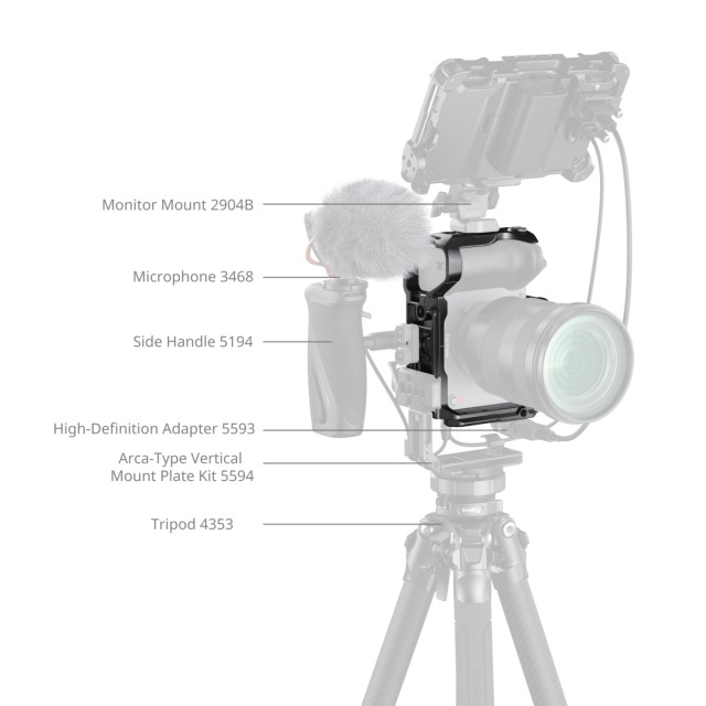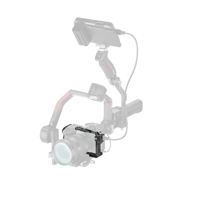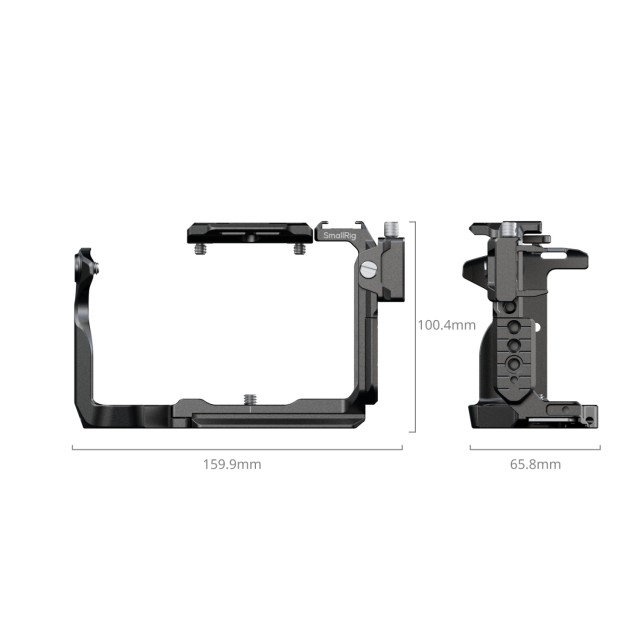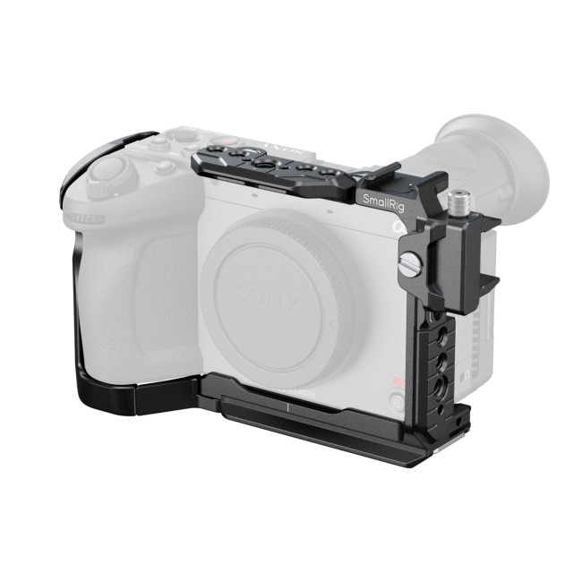 Odnímateľná horná doska je vybavená lištou NATO, ktorá pojme hornú rukoväť Sony XLR alebo otočnú hornú rukoväť SmallRig (ID 4152) bez toho, aby zasahovala do EVF. Klietka obsahuje viacero montážnych bodov, vrátane otvorov so závitom 1/4"-20, polohovacích otvorov ARRI 3/8"-16 a lišty NATO „HawkLock“ pre rýchle pripevnenie príslušenstva, ako sú bočné rukoväte (ID 4485) a horné rukoväte (ID 4483). Držiak na studený pätku umožňuje pripevnenie zariadení, ako je DJI Mic 2 alebo LED svetlá, zatiaľ čo QD zásuvka v základni pojme ramenné popruhy pre lepšiu prenosnosť. Základňa je tiež vybavená magnetickým imbusovým kľúčom, ktorý uľahčuje rýchlu montáž a demontáž.