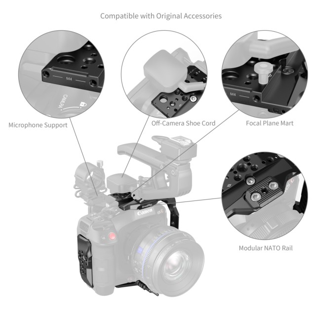 Prispôsobte si zostavu Canon EOS C80 pomocou súpravy SmallRig Cage Kit 5136 - modulárneho systému klietky navrhnutého na maximálnu flexibilitu a podporu príslušenstva. Jeho dosky možno nakonfigurovať tak, aby vyhovovali nastaveniam statívu aj gimbalu, zatiaľ čo viaceré závity 1/4"-20 a ARRI 3/8"-16, koľajnice NATO, držiak na studenú päticu a zásuvka QD poskytujú široké možnosti montáže. Dodávaná rýchloupínacia základňa Arca-Swiss, svorka na kábel HDMI a horná rukoväť so svorkou NATO zlepšujú použiteľnosť aj manipuláciu. Nastaviteľná podpera adaptéra objektívu zabezpečuje dodatočnú stabilitu pri používaní ťažších objektívov, vďaka čomu je táto klietka robustným riešením pre profesionálnu videoprodukciu.