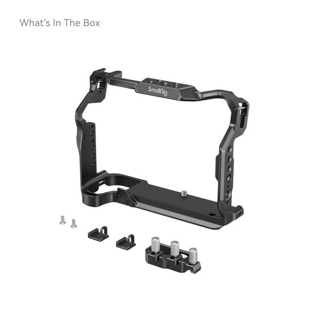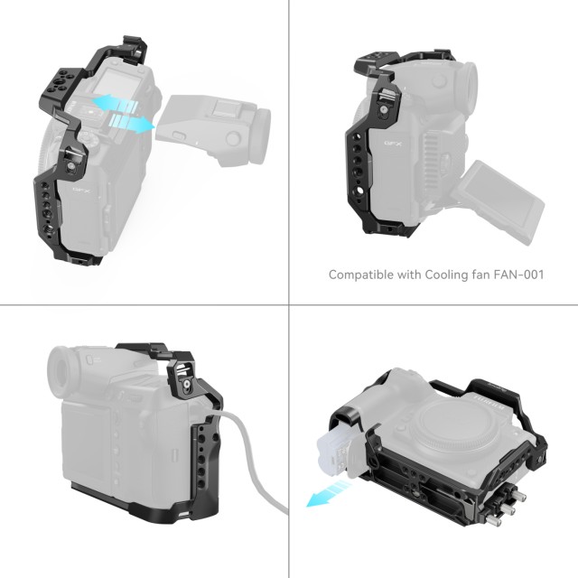 Súprava SmallRig Cage Kit pre FUJIFILM GFX100 II 4201B je určená na ochranu fotoaparátu a pripevnenie príslušenstva. Súprava obsahuje klietku a svorku na káble HDMI a USB-C. Klietka, ktorá uzamyká fotoaparát FUJIFILM GFX100 II pomocou jednej skrutky 1/4"-20 na spodnej strane a jedného bočného uzamykacieho adaptéra na oboch stranách, je vybavená gumovými podložkami, ktoré zabraňujú poškriabaniu. Ponecháva priestor pre EVF, chladiaci ventilátor FAN-001 a poskytuje plný prístup k tlačidlám, slotom na karty, výklopnému displeju a dvierkam batérie.