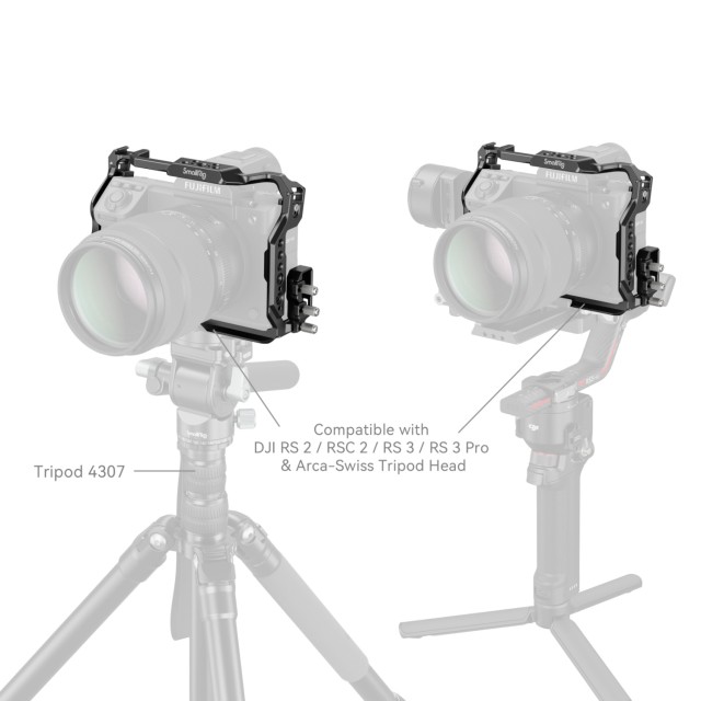 Súprava SmallRig Cage Kit pre FUJIFILM GFX100 II 4201B je určená na ochranu fotoaparátu a pripevnenie príslušenstva. Súprava obsahuje klietku a svorku na káble HDMI a USB-C. Klietka, ktorá uzamyká fotoaparát FUJIFILM GFX100 II pomocou jednej skrutky 1/4"-20 na spodnej strane a jedného bočného uzamykacieho adaptéra na oboch stranách, je vybavená gumovými podložkami, ktoré zabraňujú poškriabaniu. Ponecháva priestor pre EVF, chladiaci ventilátor FAN-001 a poskytuje plný prístup k tlačidlám, slotom na karty, výklopnému displeju a dvierkam batérie. Medzi jeho montážne body patrí závitový otvor 1/4"-20, polohovací otvor ARRI 3/8"-16, koľajnica NATO, studená pätica a polohovací otvor 1/4"-20. Podporuje bočnú rukoväť 2093C / 4016 / 3847, hornú rukoväť 3765, držiak monitora 2903 / 2904, mini V Mount Battery Plate 2987, svorku na jednu tyč 3598, magické rameno 3873, mikrofón 3468, LED video svetlo 4055 atď. K dispozícii sú aj otvory na popruhy pre ručný popruh 3848 a ramenný popruh 3485, úchyty QD pre ramenný popruh 4118 a spodná rýchloupínacia doštička Arca Swiss pre statívy typu Arca alebo gimbaly DJI RS 2 / RSC 2 / RS 3 / RS 3 Pro na rýchle prepínanie medzi režimami gimbalu, ručného držania a statívu. A svorka kábla HDMI a USB-C, zabezpečená pomocou skrutky na palec, pomáha zabezpečiť stabilný prenos signálu.