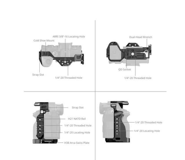 Klietka, vyrobená z odolnej zliatiny hliníka a nehrdzavejúcej ocele, chráni váš fotoaparát a zároveň zachováva plný prístup k portom, ovládacím prvkom a priestoru pre batériu vďaka inteligentnej konštrukcii s pántmi. Dvojité bočné dosky s aretáciou zabezpečujú, že fotoaparát zostane pevne na mieste bez krútenia. Klietka je vybavená viacerými 1/4"-20 a 3/8"-16 závitmi typu ARRI proti krúteniu, lištou NATO, zásuvkou QD, drážkami na popruhy a dvojitými držiakmi na studené pätice, čo ponúka rozsiahle možnosti pre montáž príslušenstva, ako sú monitory, mikrofóny a svetlá.