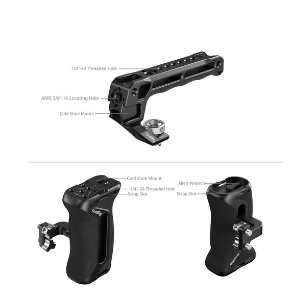 Súčasťou balenia je horná rukoväť s uchytením typu ARRI, ktorá umožňuje pohodlné natáčanie z ruky a zábery z nízkeho uhla, pričom ponúka ďalšie montážne závity a možnosti uchytenia na studenú päticu. Nastaviteľnú bočnú rukoväť je možné namontovať na ľubovoľnú stranu pre lepšiu stabilitu pri natáčaní z ruky a ergonomickú obsluhu. Súčasťou balenia je aj svorka na HDMI kábel, ktorá kábel zaistí a zabráni jeho náhodnému odpojeniu počas natáčania.