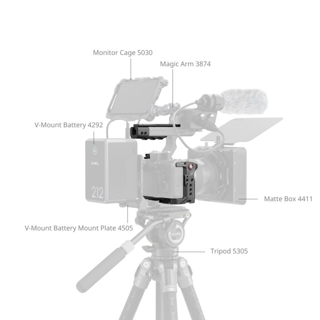 Súprava klietky pre Sony FX2 (model 5588) - predĺženie rukoväte XLR: Zlepšuje ergonómiu vďaka rozšírenej oblasti úchopu a integruje otvory so závitom 1/4"-20 na montáž monitorov alebo príslušenstva.