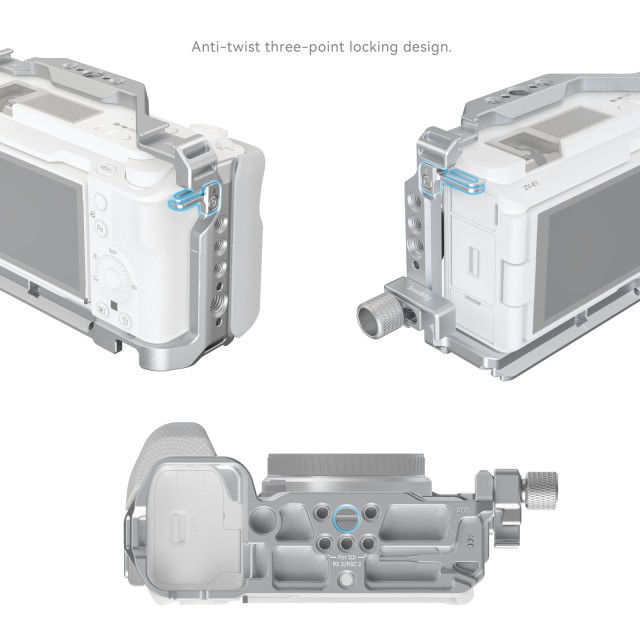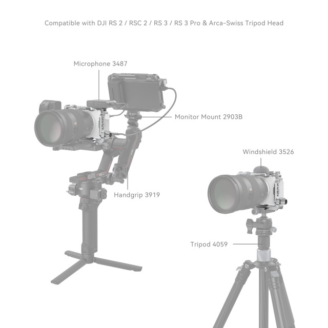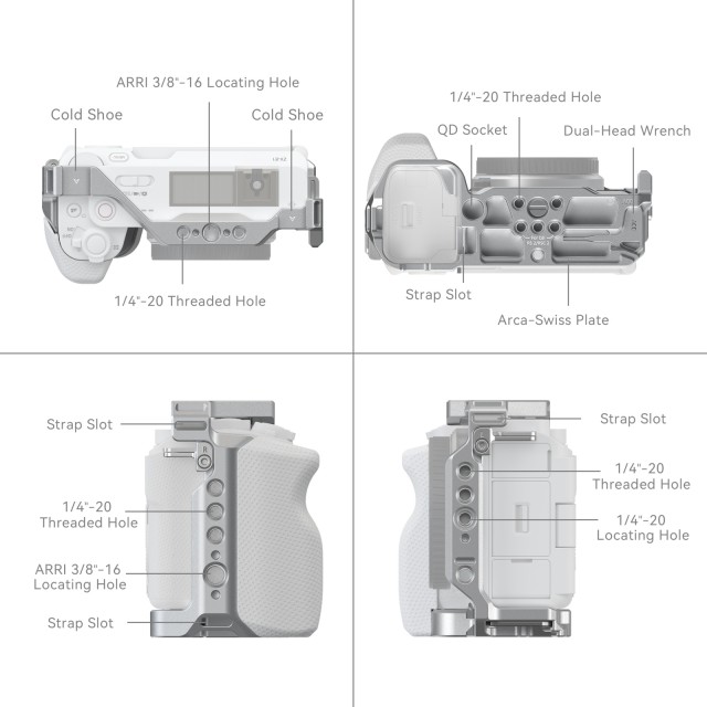 K dispozícii je viacero montážnych bodov pre príslušenstvo vrátane závitových otvorov 1/4"-20 a polohovacích otvorov ARRI 3/8"-16 pre hornú rukoväť 3765, bočnú rukoväť 2913, jeden horný polohovací otvor ARRI 3/8"-16 pre držiak monitora 2903B, dva držiaky cold shoe pre mikrofón, LED video svetlo a spodnú zásuvku QD pre ramenný popruh. Rýchloupínacia doska Arca-Swiss na spodnej strane podporuje stabilizátory DJI RS 2 / RSC 2 / RS 3 / RS 3 Pro, rýchloupínaciu dosku stabilizátora DJI RS 2 / RSC 2 (podložka na zvýšenie výšky) a rýchloupínaciu dosku Arca-Type 3154. Táto položka je tiež vybavená otvormi na popruhy na oboch stranách a v spodnej časti, ktoré sú kompatibilné s ručným popruhom PAC2456, ramenným popruhom PSC2428 atď. Okrem toho je súčasťou balenia magnetický kľúč na jednoduchú demontáž a montáž.
