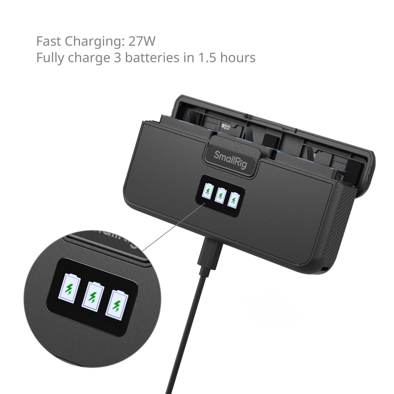 Nabíjačka batérií SmallRig pre GoPro 9/10/11/12 5418 disponuje robustným ultra rýchlym nabíjaním PD 27 W, ktoré umožňuje simultánne úplné nabitie troch batérií a poskytuje efektívne a výkonné nabíjacie schopnosti.