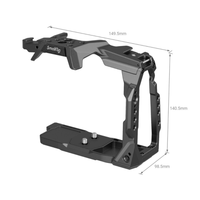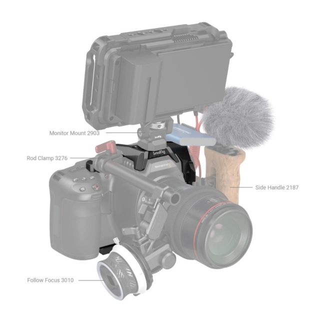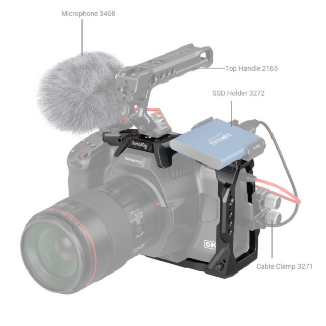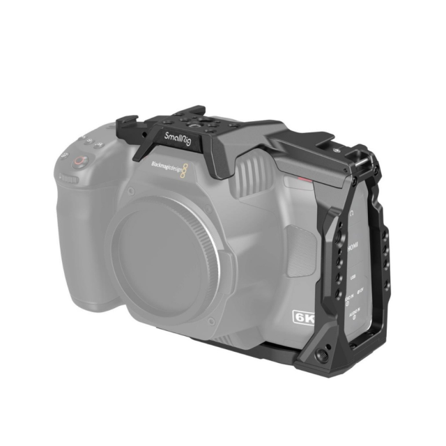 Polovičná klietka SmallRig pre BMPCC 6K Pro 3665 poskytuje montážne body pre príslušenstvo na uľahčenie snímania. Upevňuje kameru pomocou jednej 1/4" skrutky na hornej strane a dvoch na spodnej strane, aby sa zabránilo prekrúteniu. Na jej hornej strane sa nachádzajú otvory so závitom 1/4''-20 pre držiak monitora BSE2294, polohovacie otvory ARRI 3/8" -16 pre polohovacie držadlo ARRI 2165 a cold shoes pre mikrofóny, LED svetlá, držiak SSD 3272 atď. Jeho ľavá strana je vybavená lištou NATO, ktorá podporuje otočnú rukoväť NATO 3260 a rukoväť NATO 2270, a otvormi so závitom 1/4''-20, ktoré podporujú svorku kábla HDMI a USB-C 3271 na zabezpečenie stabilného prenosu údajov; jeho pravá strana je vhodná pre pôvodnú rukoväť kamery. Predná časť klietky je vybavená jedným otvorom 1/4''-20 v hornej časti a jedným otvorom 1/4''-20 v dolnej časti na pripevnenie svorky na tyč 3276. Základná doska obsahuje otvory so závitom 1/4''-20 a 3/8"-16 pre rýchloupínacie dosky 1280 a 2146, ako aj predĺženú rýchloupínaciu dosku DJI RS 2 a imbusový kľúč na ľahký prístup. Zabudované silikónové vankúšiky môžu zabrániť poškriabaniu. Okrem toho sú tu otvory na inštaláciu ramenného alebo zápästného popruhu. Klietka bez problémov zapadá do kamery a zachováva prístup k tlačidlám, slotom na karty a otvorom.