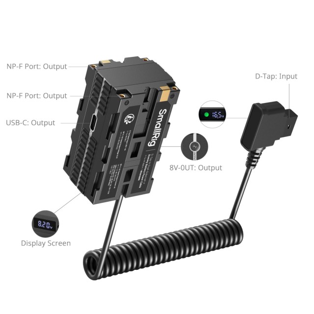 Napájací kábel SmallRig D-Tap na obojstrannú dummy batériu NP-F 4884 je multifunkčný napájací kábel na atrapu batérie s jedným vstupom D-Tap a štyrmi výstupmi: dva výstupy NP-F, jeden výstup DC a jeden výstup USB-C, ktorý umožňuje súčasné nabíjanie štyroch zariadení. Výstupy NP-F napájajú monitory a vysielače videa, výstup DC napája fotoaparáty prostredníctvom fiktívnych batérií a výstup USB-C napája zariadenia, ako sú motory na sledovanie zaostrenia a mobilné telefóny.