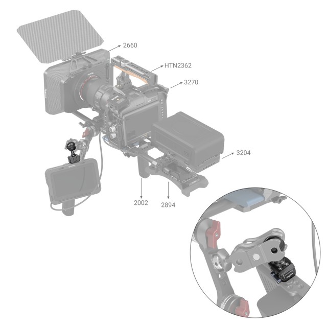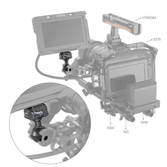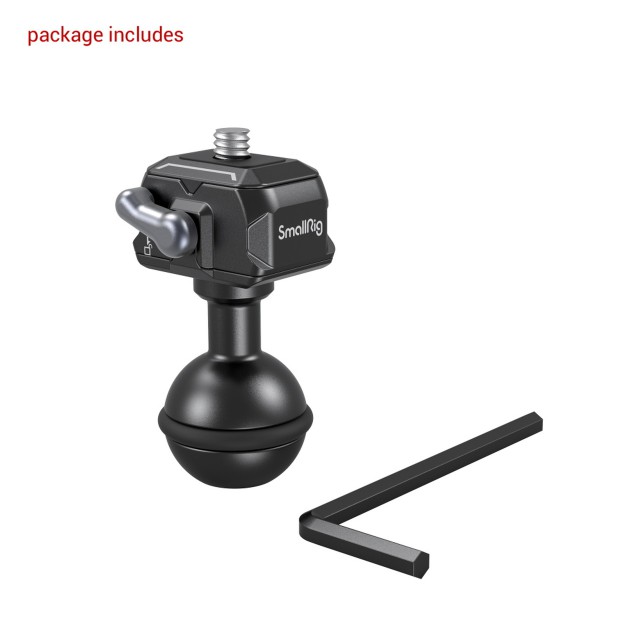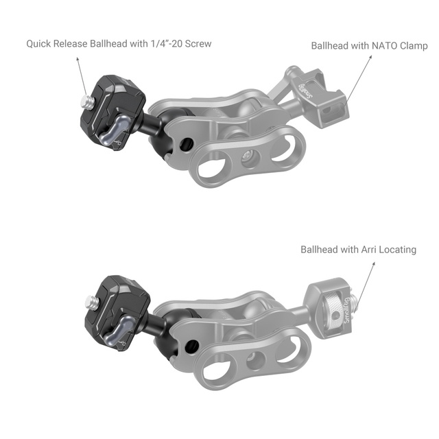 Rýchloupínacia ball head SmallRig 1/4"-20 3600, jeden koniec sa pripevňuje na guľovú hlavu a druhý koniec rýchloupínacej dosky sa hodí na zariadenia so závitom 1/4"-20, ako sú kamery, monitory, klietky, montážne dosky. Môže sa vertikálne a stabilne zapnúť do základnej dosky, pričom nespôsobuje žiadne vychýlenie. Dá sa uzamknúť a odomknúť kliknutím, poskytuje jednoduchú obsluhu. Gumové podložky na ball head zvyšujú jej trenie medzi ball head a svorkou, čím zabezpečujú bezpečné zaistenie. Táto ball head je tiež vymeniteľná s guľovými hlavami na oboch koncoch ramien Magic Arm 2070/2071/2072.