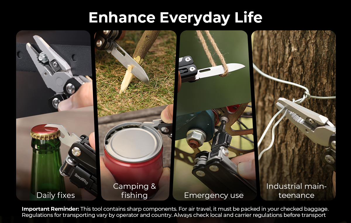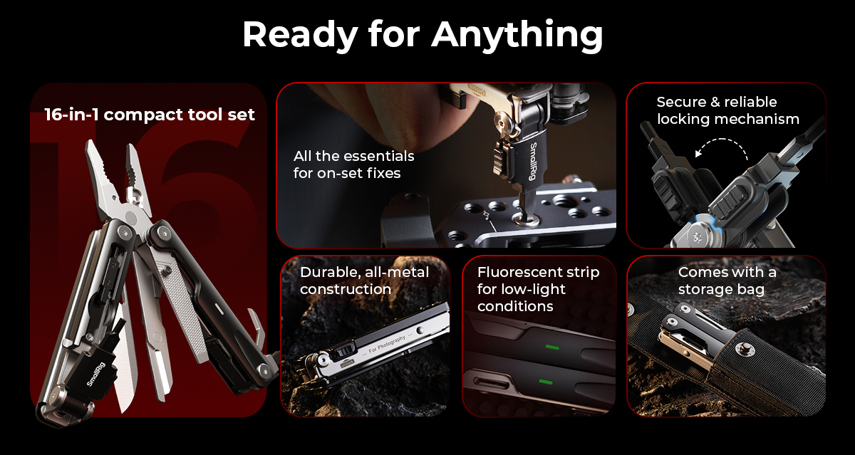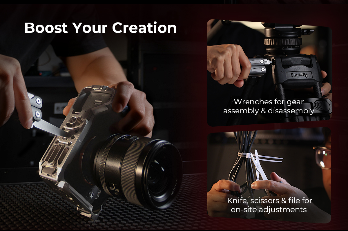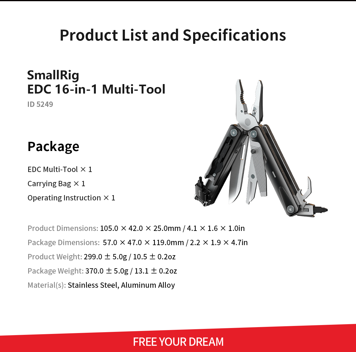 SmallRig EDC Multi-Tool 5294 je komplexné riešenie šité na mieru pre tvorcov a filmárov. Spája 16 základných nástrojov do jedného celku, vrátane imbusových kľúčov (H2, H2.5, H3, H4), plochého kľúča, noža, nožníc, pilníka a klieští – nevyhnutných pre úpravy vybavenia na cestách. Súprava obsahuje aj bežné nástroje, ako sú ploché skrutkovače SL5 a krížové skrutkovače PH1, otvárače fliaš a plechoviek a pravítko s dvojitou stupnicou (metrickou a imperiálnou). Integrovaná skladacie konštrukcia spája kompletnú sadu náradia do súpravy vo veľkosti vrecka, čím maximalizuje efektivitu na mieste.