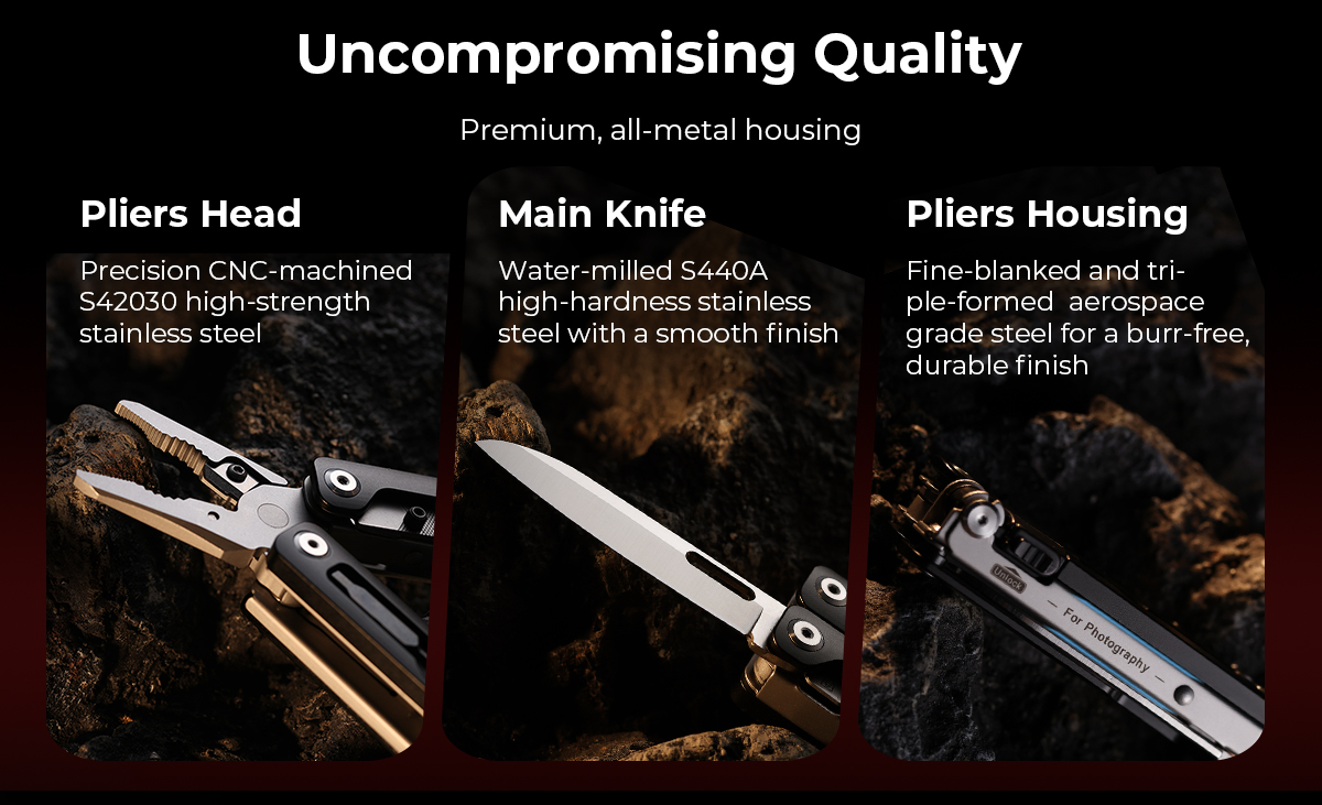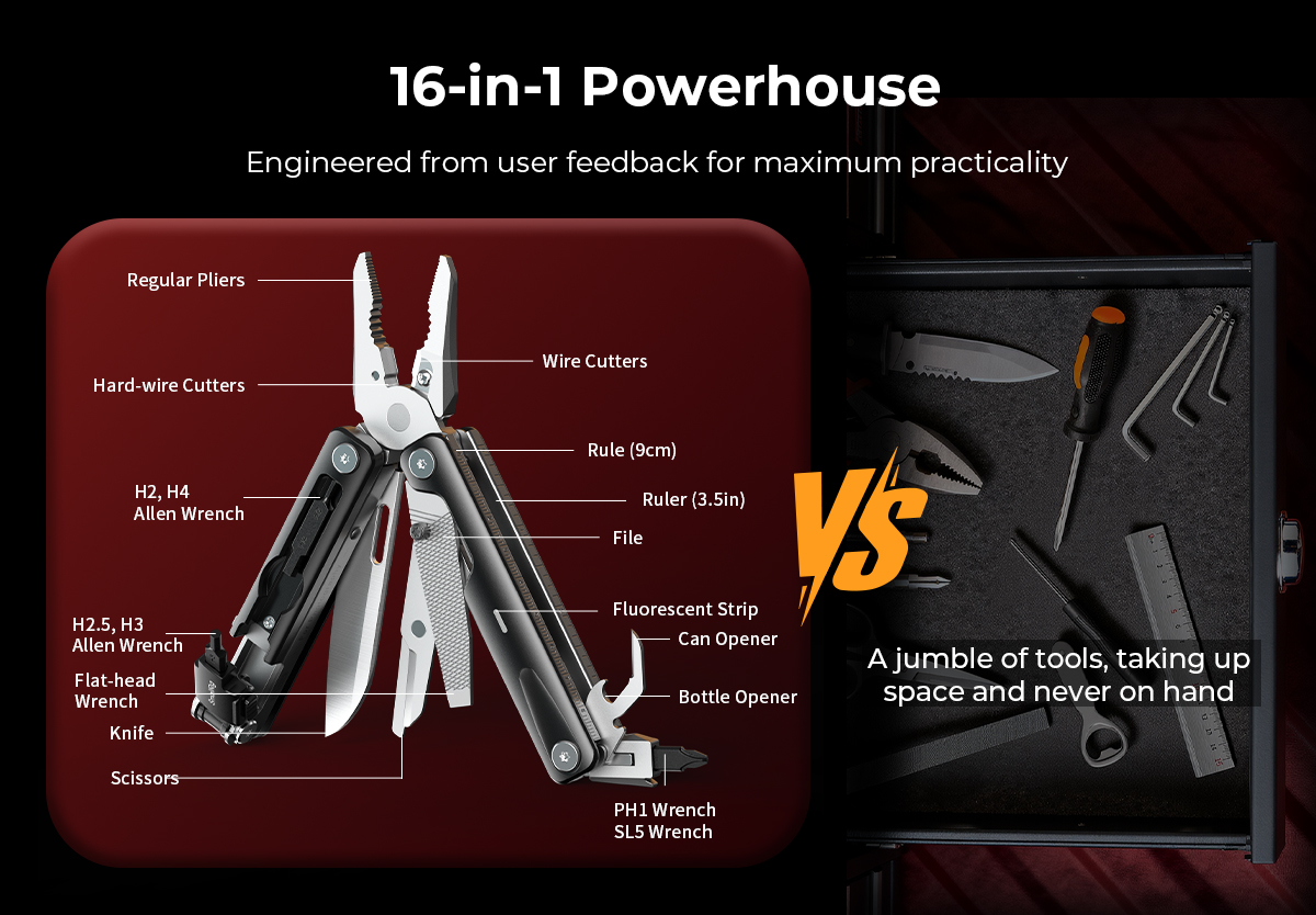 Každý nástroj je vybavený bezpečnostnou poistkou pre bezpečnú a kontrolovanú prevádzku, zatiaľ čo vonkajšie prístupné nástroje (nôž, pilník, kľúč) umožňujú rýchle použitie jednou rukou.