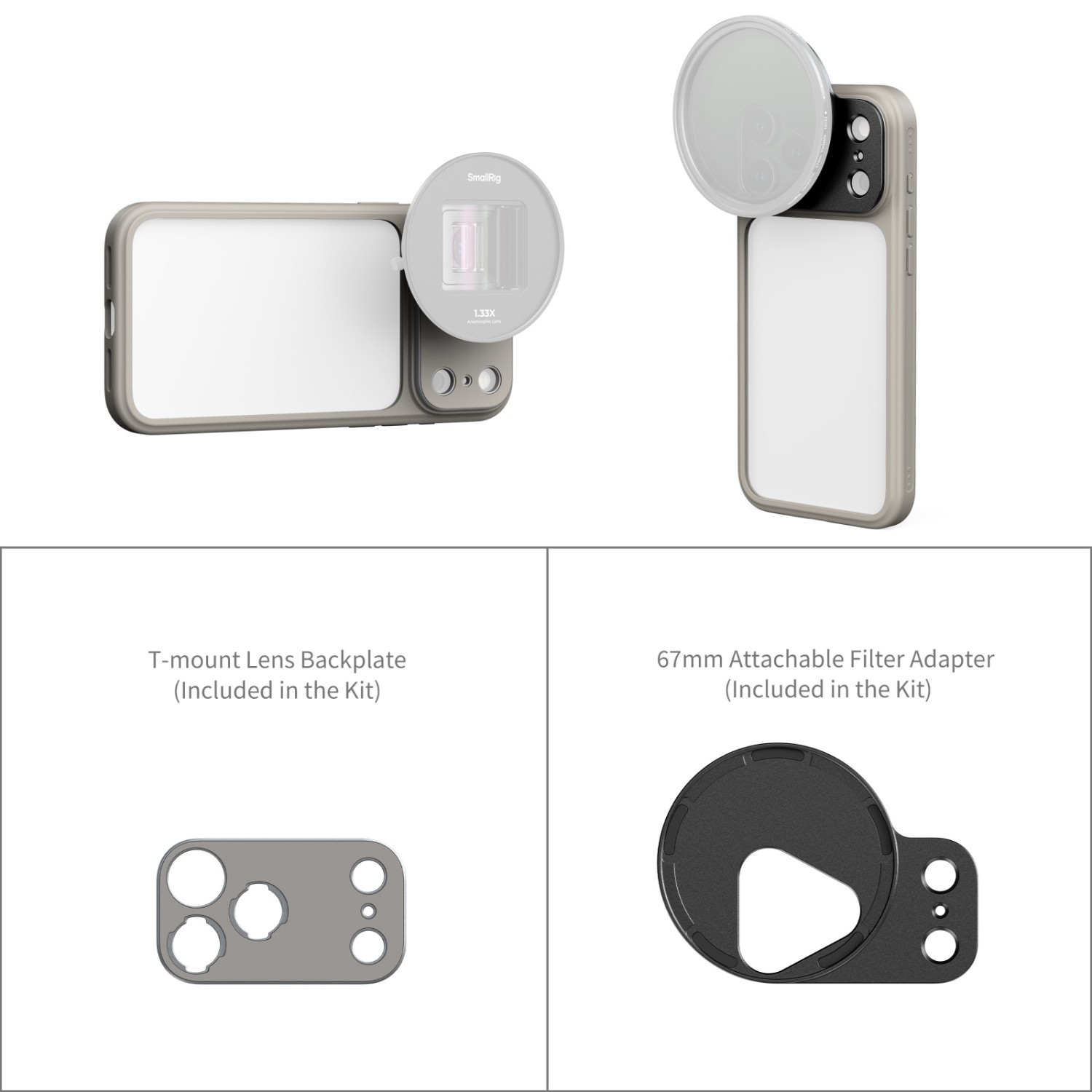 Je vybavený systémom rýchleho uvoľnenia zadnej dosky objektívu, ktorý obsahuje zadné dosky objektívu T-Mount a 67 mm pripájateľné adaptéry filtrov pre rýchlu výmenu objektívov a magnetických filtrov. Púzdro je vyrobené z mäkkého materiálu TPU, ktorý poskytuje pohodlný úchop a zároveň základnú ochranu rohov a okrajov telefónu.