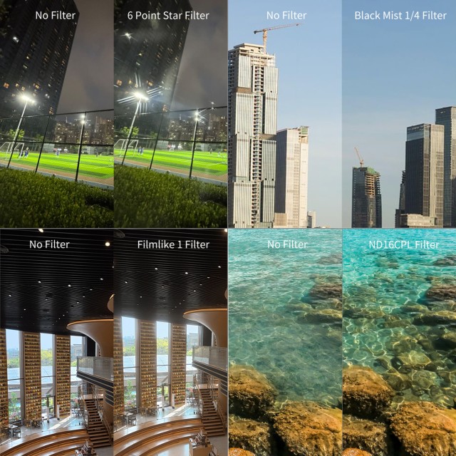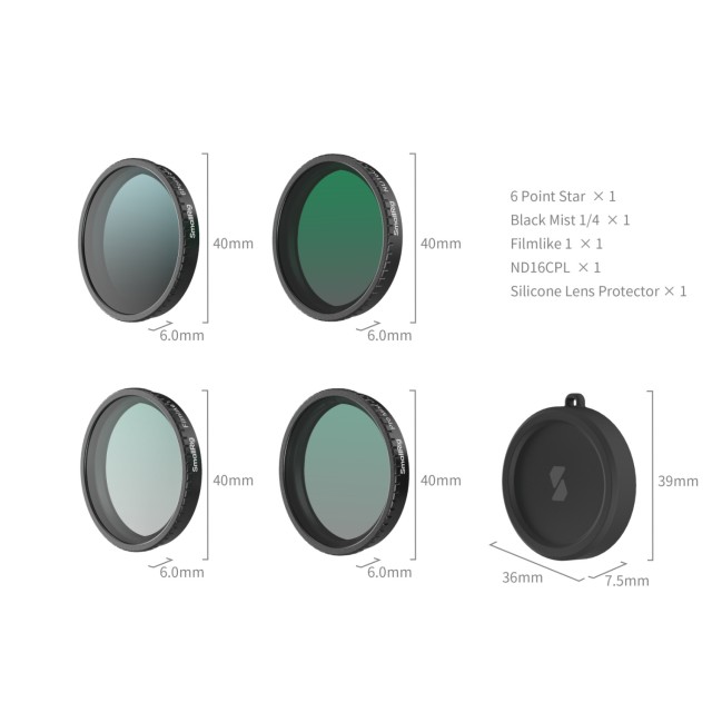 Táto súprava obsahuje 1/4 čierneho hmlového filtra, filter ND16 a CPL, filter simulujúci film, hviezdicový filter a silikónový kryt objektívu. Filter 1/4 čiernej hmly zjemňuje svetlá pre dosiahnutie snového, filmového efektu. Filter ND16 & CPL eliminuje odrazy a zároveň zabezpečuje vernú reprodukciu farieb, takže je ideálny na fotografovanie krajiny a architektúry v jasných podmienkach. Filter simulujúci film vytvára analógové filmové tóny, ktoré sú ideálne na portréty, pouličnú fotografiu a snímky vo vintage štýle. Hviezdicový filter transformuje bodové zdroje svetla na dramatické 6-bodové hviezdice počas nočných scén. Pre väčšie pohodlie a ochranu súprava obsahuje mäkký silikónový kryt objektívu, ktorý chráni objektív fotoaparátu pred poškriabaním a prachom, keď sa nepoužíva.