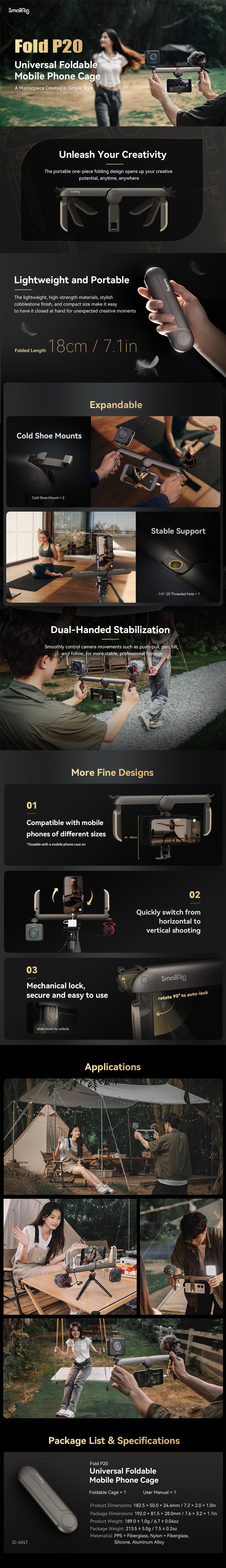 Univerzálna skladacia klietka na mobilný telefón SmallRig P20 4047 je nádherne spracovaná, možno ju používať na obojručné fotografovanie a zložiť na dĺžku len 18 cm na každodenné prenášanie. Klietka, ktorá vyzerá ako kamienok, je hladká a pohodlná. Pokiaľ ide o jej krížové rameno, na každom konci sa nachádza sklopný držiak Cold Shoe pätice pre mikrofón a LED video svetlo; a v strede je otvor so závitom 1/4"-20 pre príslušenstvo, ako je statív. Jeho rukoväte, ktoré sa dajú uložiť do krížového ramena, majú silikónové okraje pre pohodlnejšie uchopenie; a podobne ako držiaky studenej pätice sa dajú mechanicky uzamknúť na zvýšenie pevnosti a odolnosti. Táto položka podporuje mobilné telefóny so šírkou 65 - 80 mm (s puzdrami) pri horizontálnom a vertikálnom snímaní.