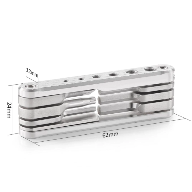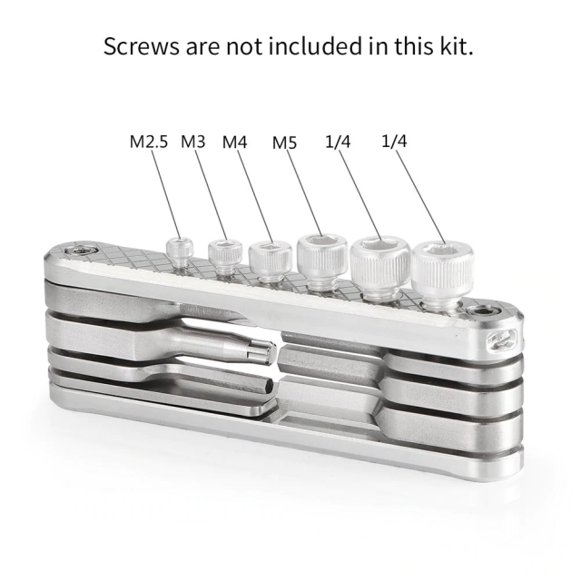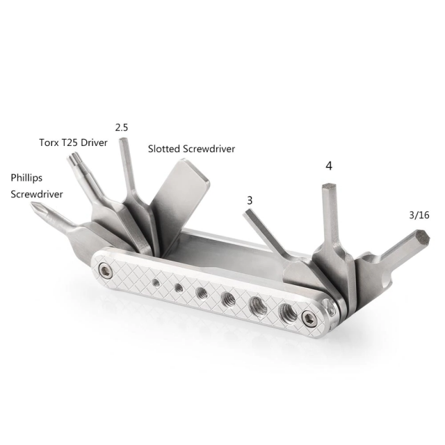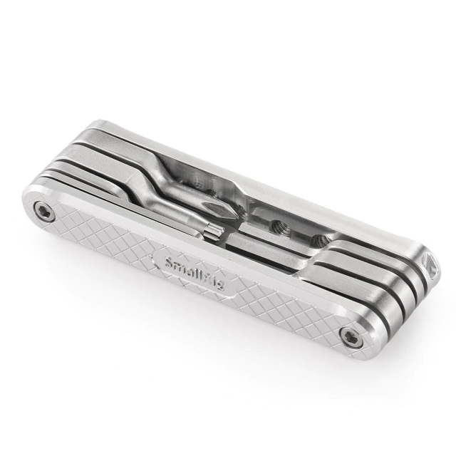 Sada skladacieho náradia SmallRig so skrutkovačmi a kľúčmi 2213. Vreckové skladacie multifunkčné náradie určené pre kameramanov. Je kompaktný a ľahko sa prenáša, čím zabraňuje strate malých kľúčov a skrutkovačov. Kľúče a skrutkovače sú vyrobené z pevnej nehrdzavejúcej ocele a bočné dosky sú z robustnej hliníkovej zliatiny. Dodáva sa so 4 imbusovými kľúčmi 2,5, 3, 4, 3/16, 1 skrutkovačom s drážkou, 1 krížovým skrutkovačom a 1 skrutkovačom Torx T25, ktoré pokrývajú potreby väčšiny scenárov snímania. Okrem toho sú na bočnej strane ďalšie otvory so závitom M2,5, M3, M4, M5 a 1/4, do ktorých sa zmestia náhradné skrutky.