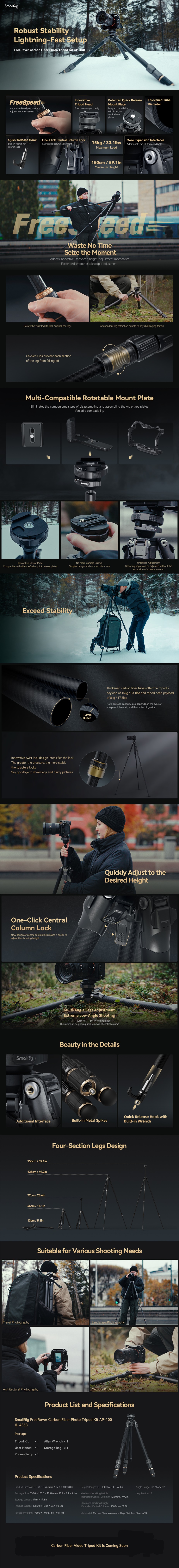 Súprava fotostatívu SmallRig FreeRover Carbon Fiber AP-100 4353 je kompaktný statív z uhlíkových vlákien navrhnutý špeciálne pre fotografov na cestách. Nohy sú vybavené rýchloupínacou konštrukciou FreeSpeed-rotate, ktorá umožňuje jednoduché a efektívne nastavenie utiahnutím jediného gombíka na zabezpečenie všetkých štyroch sekcií. Použitie 1,2 mm hrubého materiálu z uhlíkových vlákien na nohy a stredový stĺpik zabezpečuje ľahkú konštrukciu bez toho, aby sa znížila stabilita alebo nosnosť. Stredový stĺpik je vybavený rýchloupínacou pákou na rýchle nastavenie výšky. Spodná časť stredového stĺpika je vybavená rýchloupínacím hákom s imbusovým kľúčom, ktorý umožňuje pohodlné upevnenie a odpojenie vybavenia fotoaparátu. Okrem toho je stredový stĺpik vybavený funkciou odnímateľného krátkeho stĺpika, ktorý poskytuje minimálnu výšku 13 cm na snímanie z malých uhlov. Statív má obrátenú guľovú hlavu, ktorá vďaka zapustenej konštrukcii umožňuje kompaktnejšiu a prenosnejšiu konštrukciu v zloženom stave.
