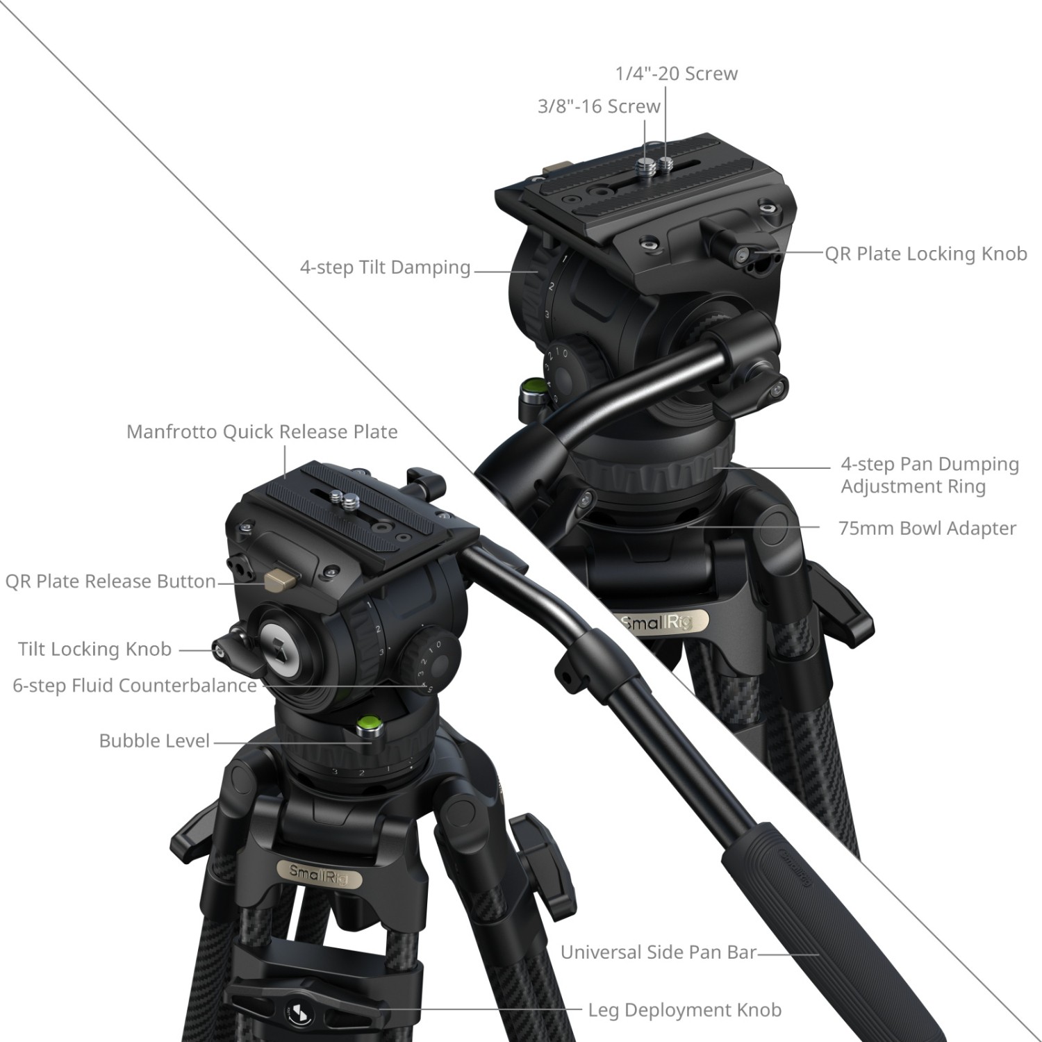 Statív je vyrobený z uhlíkových vlákien (Ø16 mm) v 3-dielnej konfigurácii 2-2-1 a so štandardnou 75 mm misovou základňou. Je vybavený fluidnou hlavou s 6-stupňovým protiváhou a nezávislým 4-stupňovým ovládaním tlmenia naklápania/otočenia. Vyvažovací mechanizmus podporuje zaťaženie od 0 kg do 6 kg (0 lb až 13,2 lb), zatiaľ čo hlava ponúka bezpečnú prevádzkovú hmotnosť 10 kg (22 lb) a maximálnu nosnosť 15 kg (33,1 lb). Pracovná výška statívu sa pohybuje od 93,6 cm do 214 cm (36,9 palca až 84,3 palca), čo zaručuje stabilitu pri vysokom zaťažení a plynulý pohyb pri fotografovaní z vysokého uhla.