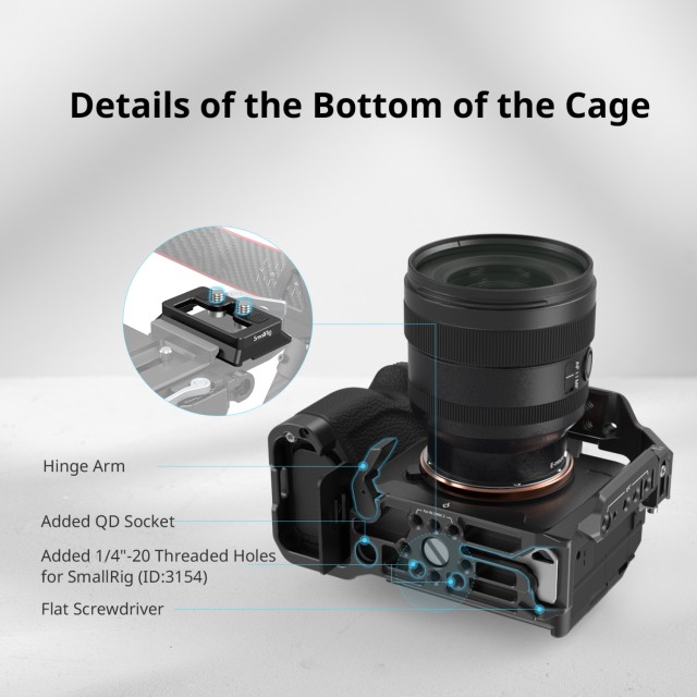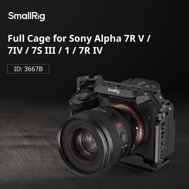 SmallRig Full Cage pre Sony Alpha 7 IV/Alpha 7 S III/Alpha 1 3667 je navrhnutý tak, aby poskytoval úchyty pre príslušenstvo a chránil fotoaparát. Súčasťou balenia sú dve uzamykacie bočné dosky spolu s jednou skrutkou 1/4"-20 v spodnej časti, ktoré zabezpečujú fotoaparát a zabraňujú jeho vychýleniu. Zabudované celoplošné ochranné dištančné podložky zabraňujú poškriabaniu fotoaparátu. Klietka umožňuje prístup k rozhraniam, ovládačom, tlačidlám alebo batérii. V priestore pre batériu sa nachádza vretenový kľúč, ktorý sa prispôsobí zakriveniu fotoaparátu a ponechá priestor pre prst na pohodlné uchopenie. Otvory so závitom 1/4"-20, lokalizačné otvory ARRI 3/8"-16 a cold shoes podporujú hornú rukoväť 2165, bočnú rukoväť 2093, držiak monitora 2903, mikrofóny, LED svetlá, monitory atď.