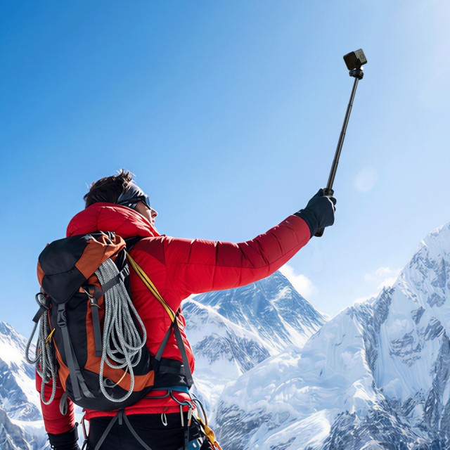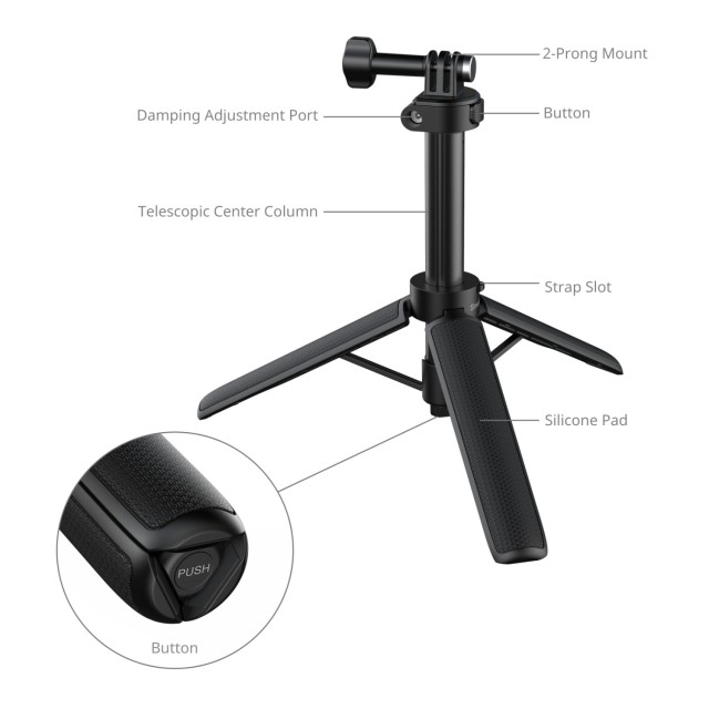 Je optimalizovaný pre prenosnosť, jeho 4-dielna teleskopická tyč sa zloží na 18 cm (7,1") pre jednoduché uloženie v batohu alebo vrecku, ale zároveň sa dá predĺžiť na 52 cm (20,5"), aby vyhovoval širokej škále požiadaviek na výšku snímania.