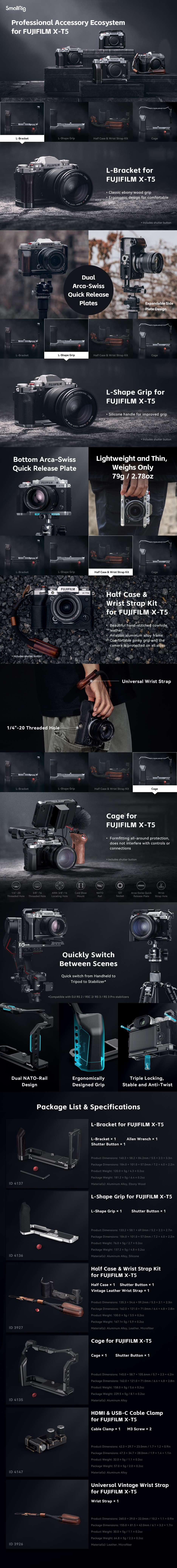 Grip SmallRig v tvare písmena L pre fotoaparát FUJIFILM X-T5 4136 je navrhnutý tak, aby zlepšil vaše držanie fotoaparátu. Vďaka rovnakej textúre a farbe sa dokonale hodí k fotoaparátu FUJIFILM F2. Grip ľahko uzamkne fotoaparát pomocou obyčajnej skrutky s D-krúžkom 1/4"-20 v spodnej časti, kde sú zahrnuté aj viaceré úchyty na príslušenstvo. Patrí medzi ne rýchloupínacia doštička Arca-Swiss pre statívy Arca-Swiss, tri otvory 1/4"-20 pre statívy alebo doštičky typu Manfrotto a otvor na popruh pre ručný popruh 3848. Grip má tenkú a kompaktnú základnú dosku, ktorá váži len 79 g. Dodáva sa aj s tlačidlom spúšte na zlepšenie dotyku.