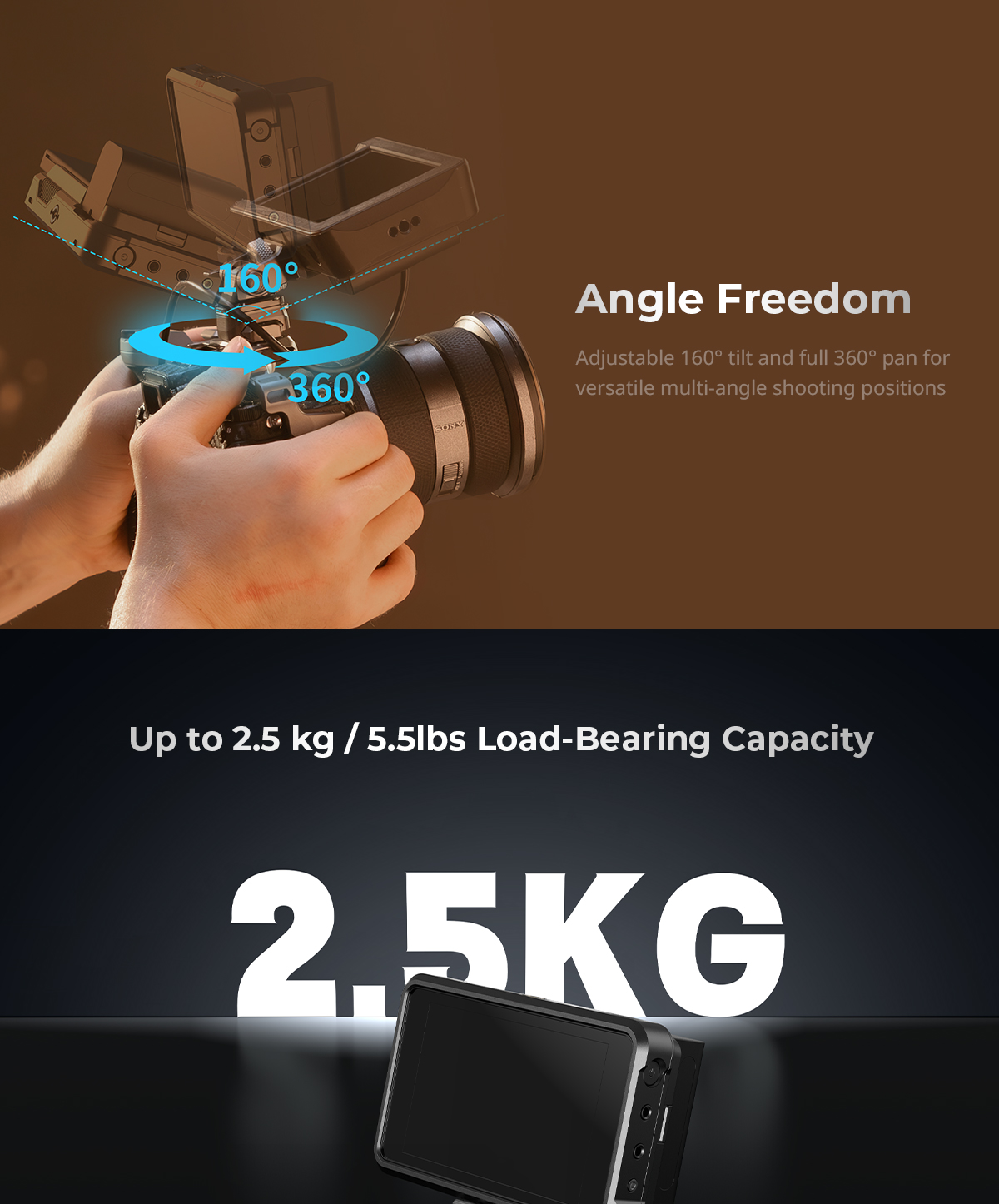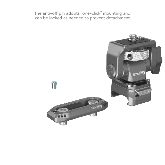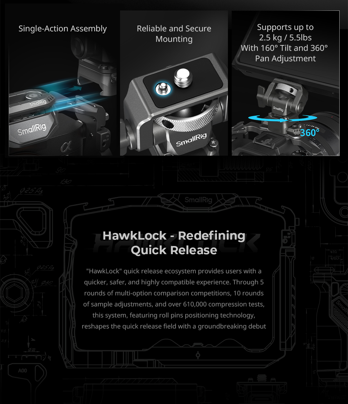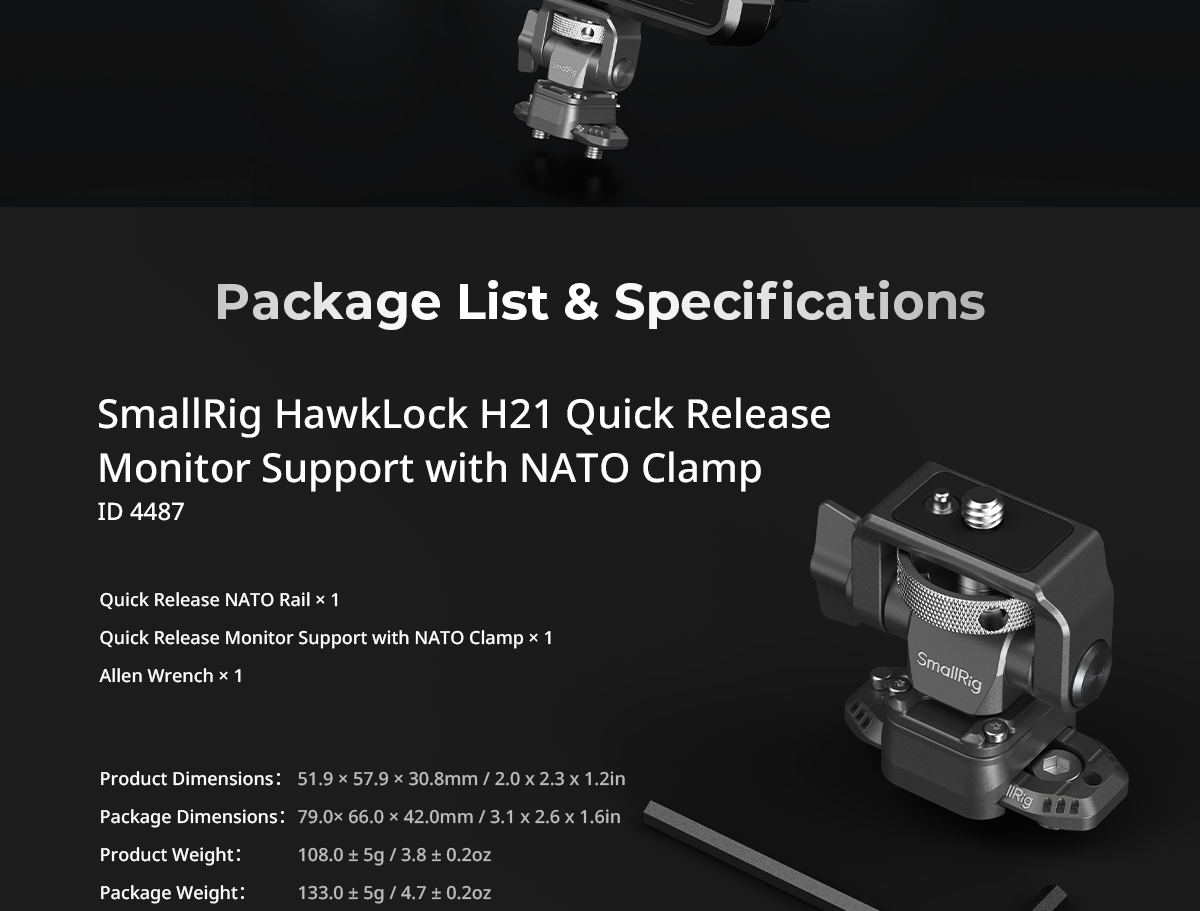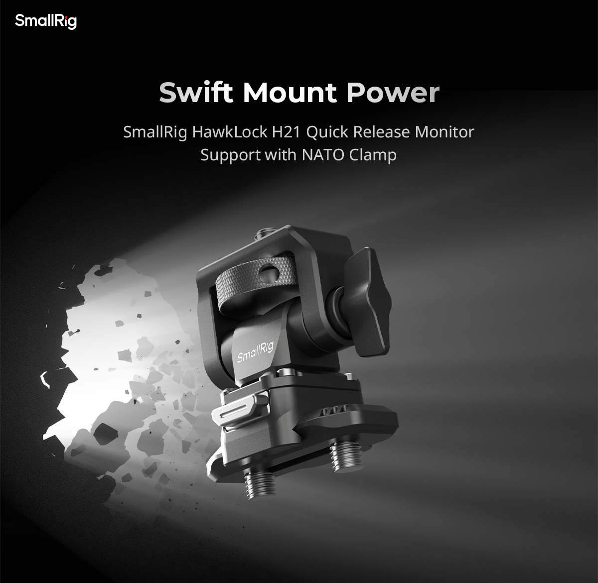 Rýchloupínací držiak monitora SmallRig HawkLock H21 so svorkou NATO 4487 pozostáva z rýchloupínacieho držiaka monitora so svorkou NATO a rýchloupínacej lišty NATO. Stlačením tlačidla sa kolíky roztvoria a koľajnica NATO sa zasunie do drážky. Uvoľnením tlačidla koľajnicu NATO bezpečne zaistíte v držiaku monitora, vďaka čomu je konštrukcia stabilná a proces časovo nenáročný. Skrutku 1/4"-20 na hornej strane možno použiť na upevnenie monitora, mikrofónu, svetla alebo, vďaka zabudovanému pružinovému polohovaciemu kolíku, monitora Ninja V / Ninja V+, aby sa zabránilo vychýleniu. Položka podporuje nastavenie sklonu v uhle 160° a tesnosť osi sklonu možno rýchlo upraviť pomocou gombíka, aby sa lepšie prispôsobila zariadeniam s rôznou hmotnosťou. Zariadenie unesie až 2,5 kg / 5,5 lb a útlm je po 10 000 nakloneniach nižší ako 20 %, vďaka čomu je odolné. nastavenie otočenia o 360° s nastavením tesnosti horizontálnej osi pomocou priloženého šesťhranného kľúča.