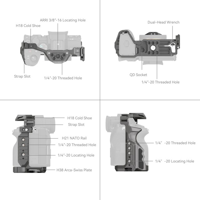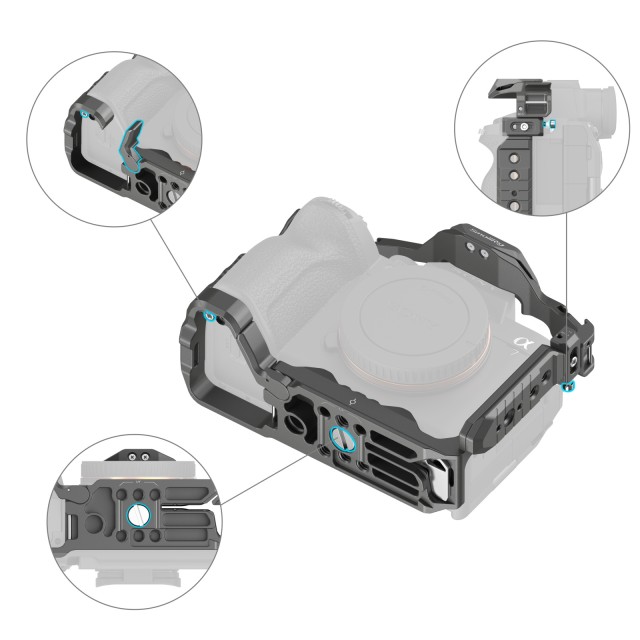 Rýchloupínacia klietka SmallRig HawkLock pre Sony Alpha 7R V / Alpha 7 IV / Alpha 7S III / Alpha 1 / Alpha 7R IV 4481 je navrhnutá tak, aby poskytovala úchyty pre príslušenstvo a chránila fotoaparát. Patentovaná samostatne vyvinutá rýchloupínacia štruktúra (s názvom HawkLock) pokrýva studené topánky, koľajnicu NATO a arca swiss, ktorá sa používa s ekologickým príslušenstvom HawkLock na realizáciu pevnej a žiadnej falošnej polohy, jedným stlačením sa načíta, uvoľnením sa uzamkne a zlepší sa účinnosť demontáže. Zamyká fotoaparát prostredníctvom jedného spodného polohovacieho kolíka, jednej skrutky 1/4"-20 a jednej skrutky M2,5 na ľavej strane.