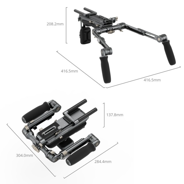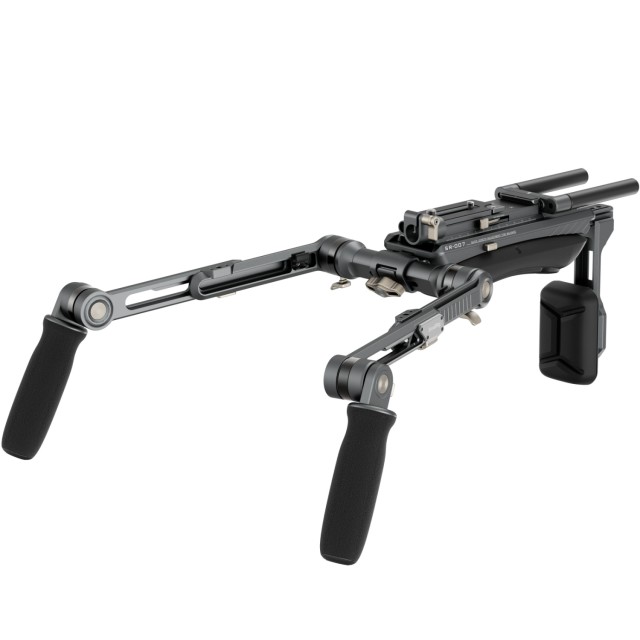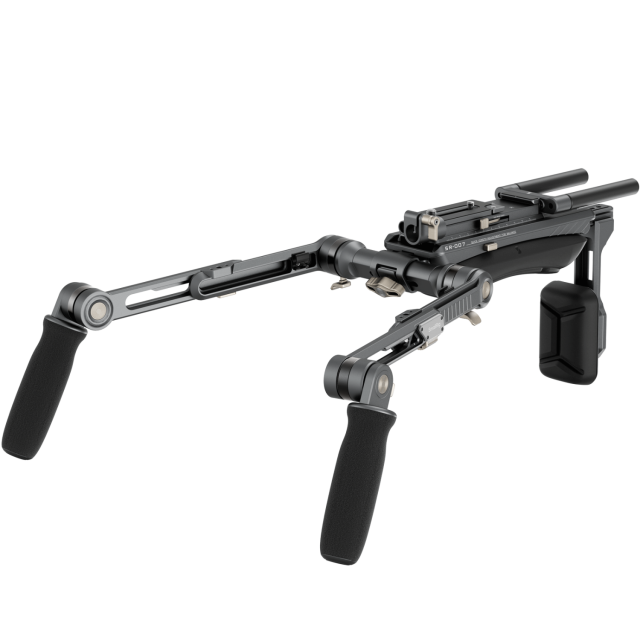 Súprava Shoulder Rig je vybavená ergonomickými rukoväťami s jemnou textúrou, ktoré poskytujú pohodlné uchopenie a uľahčujú otáčanie o 360°. Spojovací hriadeľ predlžovacích ramien možno nastaviť horizontálne na optimalizáciu ovládania, zatiaľ čo zefektívnené ramenné a chrbtové podložky poskytujú výnimočnú oporu. Chrbtová podložka sa dá nastaviť až do 90° na presné prispôsobenie pri akomkoľvek uhle snímania a rýchloupínacia doska umožňuje jednoduché nastavenie prednej časti ramena na rýchle vyváženie.