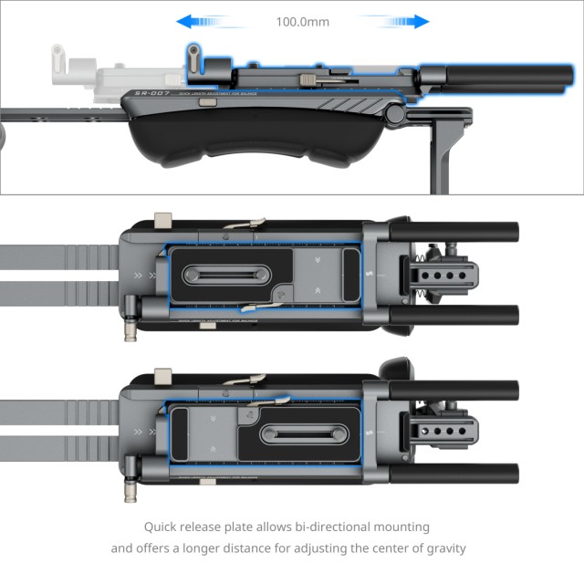 Rukoväť, pripevnená pomocou rozety ARRI, sa dá odpojiť na montáž ďalšieho príslušenstva. Všestranné možnosti rozšírenia zahŕňajú aj zabudované polohovacie otvory 1/4"-20 na predlžovacích ramenách na upevnenie monitora pomocou magického ramena a 15 mm tyčovú svorku spolu s dvoma 15 mm tyčami na montáž follow focusu a batérií V-Mount. Viaceré otvory so závitom 1/4"-20 na zadnej strane sú vhodné na umiestnenie protizávažia, zatiaľ čo káblové svorky na oboch predlžovacích ramenách udržujú nastavenie v poriadku.