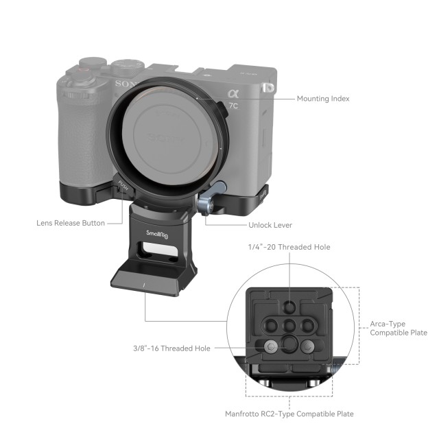 Súprava SmallRig Horizontal-to-Vertical Mount Plate Kit pre Sony Alpha 7C II / Alpha 7CR 4570 je navrhnutá na rýchle prepínanie medzi horizontálnym a vertikálnym režimom bez nastavovania optickej osi objektívu. Zaisťuje spodnú časť fotoaparátu pomocou skrutky 1/4"-20 a kolíka proti pretáčaniu a zachováva úplný prístup k výklopnému displeju LCD a portom a je vybavená zabudovanými podložkami, ktoré zabraňujú poškriabaniu a pretáčaniu.