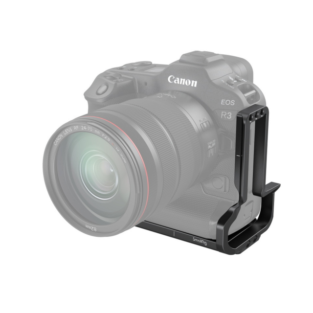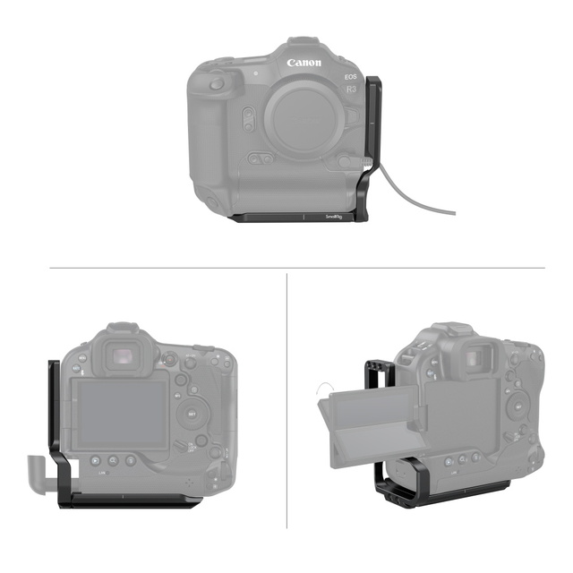 Držiak SmallRig L-Bracket pre Canon EOS R3 3628 je určený na rýchle prepínanie medzi horizontálnym a vertikálnym snímaním. Je zaistený v spodnej časti fotoaparátu pomocou skrutky 1/4"-20 a skrutky proti pootočeniu, vybavený silikónovou podložkou, ktorá zabraňuje poškriabaniu a vychýleniu, a možno ho rozložiť na základnú dosku kompatibilnú s Arca (používa sa samostatne) a bočnú dosku, obe so stredovou značkou objektívu. Držiak L-Bracket neblokuje porty, tlačidlá a dokonca do určitej miery umožňuje preklopenie obrazovky LCD. Batériu môžete vymeniť bez demontáže držiaka L-Bracket a je tiež kompatibilná s RS-80N3. Rozšíriteľná bočná doska ponecháva priestor pre káble HDMI a USB; základná doska vybavená montážnymi bodmi, ako sú otvory so závitom 1/4"-20, 3/8"-16 a otvory pre popruh na zápästie, podporuje rýchloupínaciu dosku, statív a rýchloupínaciu dosku (podložku) stabilizátorov DJI RS 2/RSC 2 atď. Okrem toho je na jednoduchú demontáž a montáž prístupný skrutkovač so štrbinou.