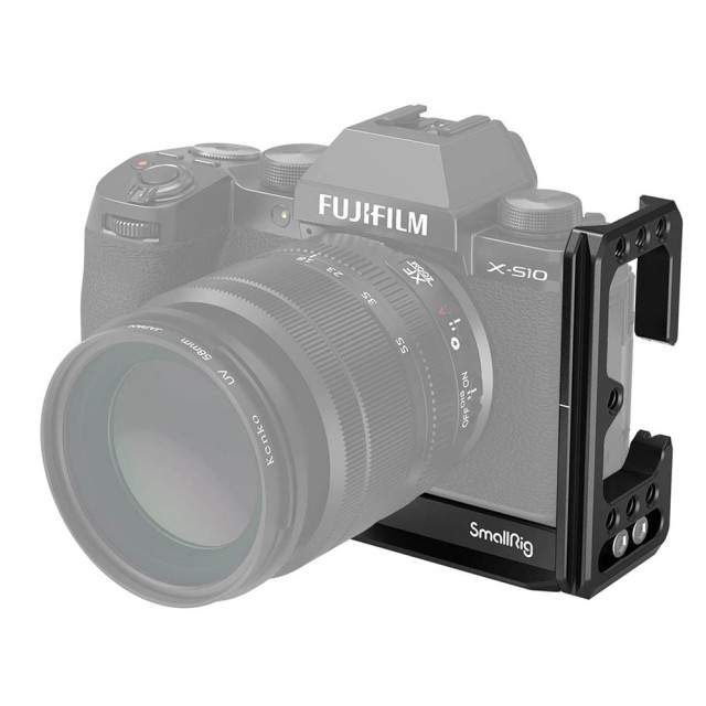 SmallRig L-Bracket pre fotoaparát FUJIFILM X-S10 3086 je modulárne navrhnutý s prírubami proti skrúteniu, ktoré zabraňujú skrúteniu fotoaparátu a poskytujú pohodlné uchopenie. Základná doska aj bočná doska sú kompatibilné s dovetail typu Arca a umožňujú montáž fotoaparátu vo vertikálnej alebo horizontálnej polohe. Každá os je vybavená líniou centrovania snímača na vyrovnanie fotoaparátu na statívovej hlave. K spodnej časti fotoaparátu sa upevňuje pomocou 1/4 skrutky a je vybavená gumovou podložkou, ktorá zabraňuje poškriabaniu fotoaparátu. Je vybavený viacerými závitmi 1/4"-20 na bočnej strane pre príslušenstvo, ako napríklad Cold Shoe 2736 a svorka na kábel HDMI 1822. Viacero otvorov so závitom 1/4"-20 a 3/8"-16 na spodnej strane slúži na upevnenie príslušenstva, ako je napríklad rýchloupínacia doštička 1280. Bočnú dosku možno posunúť dopredu, aby ste mali 180° obrazovku LCD, a možno ju vysunúť doľava, ak je potrebný väčší priestor na pripútanie alebo uvoľnenie kábla. Spodná časť je vybavená otvorom na pripevnenie remienka na ruku. Súčasťou balenia je zabudovaný imbusový kľúč a plochý skrutkovač na upevnenie skrutky fotoaparátu a ukladá sa na spodnej strane L-držiaka.