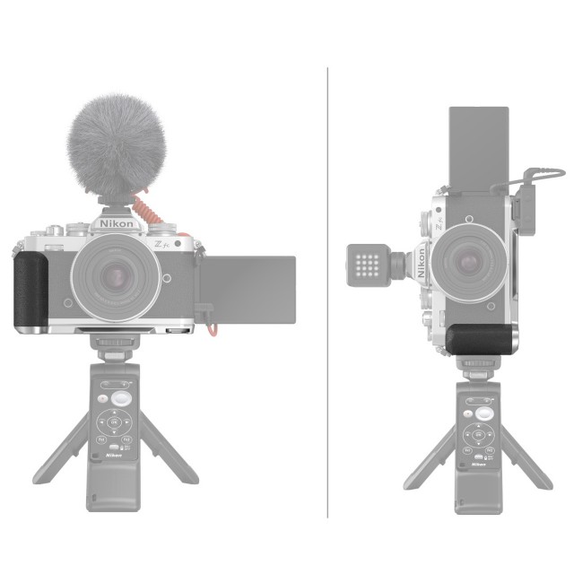 Grip SmallRig v tvare L pre fotoaparát Nikon Z fc 3480 je navrhnutý tak, aby poskytoval pohodlné uchopenie. Grip v retro štýle má podobnú textúru a farbu ako fotoaparát; základná doska má rovnakú striebornú povrchovú úpravu ako fotoaparát a dokonale sedí. Grip L sa upevňuje k fotoaparátu pomocou skrutky s krúžkom D 1/4"-20 na spodnej strane a je vybavený zabudovaným otvorom so závitom 1/4"-20 na gripe, ktorý umožňuje vertikálne snímanie na statíve. Základná doska je vybavená zabudovanou doštičkou Arca Swiss na rýchle prepnutie na snímanie zo statívu a otvorom so závitom 1/4"-20 v strede, ktorý podporuje statív alebo rýchloupínaciu doštičku Manfrotto. Okrem toho je základná doska vybavená zabudovanou studenou päticou, ktorá umožňuje pripevnenie mikrofónu, svetla a ďalšieho príslušenstva; doska je tiež vybavená otvorom na zápästný popruh. Grip využíva kompaktnú a ľahkú konštrukciu, ktorá sa ľahko prenáša.