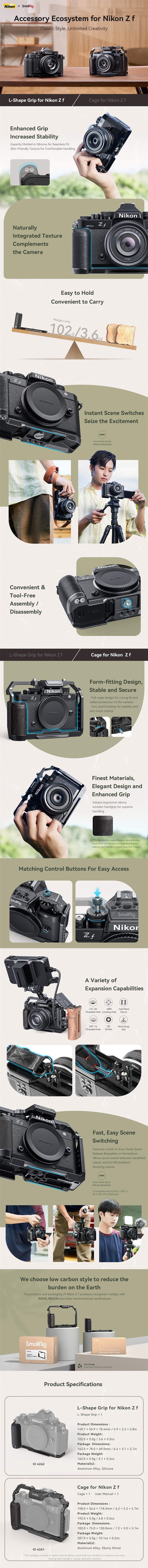 Špeciálna rukoväť SmallRig pre fotoaparát Nikon Z f 4262 je navrhnutá na zlepšenie úchopu. Dokonale sa hodí k fotoaparátu Nikon Z f, pretože má rovnakú textúru a farbu ako fotoaparát. Rukoväť sa zaisťuje pomocou skrutky s palcom 1/4"-20 s D-krúžkom na spodnej strane. Jej zabudovaná rýchloupínacia doštička Arca Swiss podporuje statívy typu Arca; tri otvory so závitom 1/4"-20 v spodnej časti podporujú aj statívy a rýchloupínacie doštičky Manfrotto; a otvory na zápästie môžu spolupracovať so zápästným popruhom 3848 / 3926. Okrem toho má spodná doska ultratenký dizajn, ktorý umožňuje dosiahnuť čistú hmotnosť iba 102 g, vďaka čomu je táto položka kompaktnejšia a ľahšia.