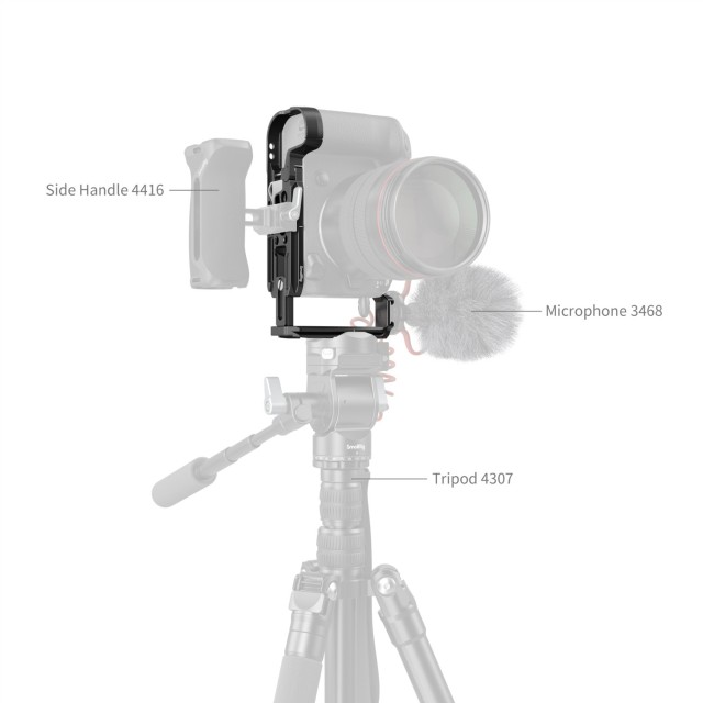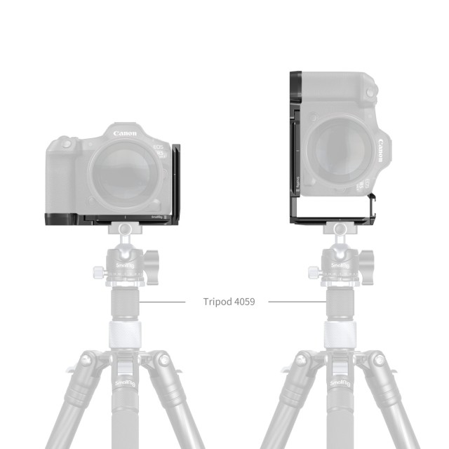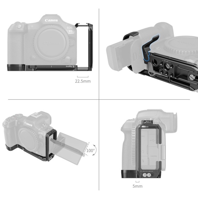 SmallRig L-Shape Mount Plate pre Canon EOS R5 Mark II 4983 je navrhnutý tak, aby pomáhal pri rýchlom prepínaní medzi orientáciou na šírku a na výšku a zároveň zlepšoval úchop tela fotoaparátu. Montážna doska v tvare písmena L sa pevne pripevňuje k fotoaparátu pomocou skrutky 1/4"-20 v základni a dvoch polohovacích blokov po stranách, ktoré zabraňujú vychýleniu, a má zabudované silikónové podložky na ochranu fotoaparátu pred poškriabaním.