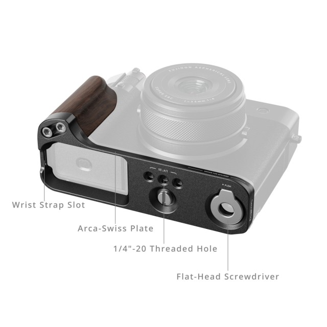 Doska SmallRig v tvare písmena L s drevenou rukoväťou pre FUJIFILM GFX100RF (čierna) 5266 je odborne navrhnutá tak, aby zlepšila estetiku aj ovládanie vášho fotoaparátu. Bezpečne sa pripevňuje pomocou skrutky 1/4"-20 a má zabudované silikónové podložky, ktoré zabraňujú poškriabaniu.