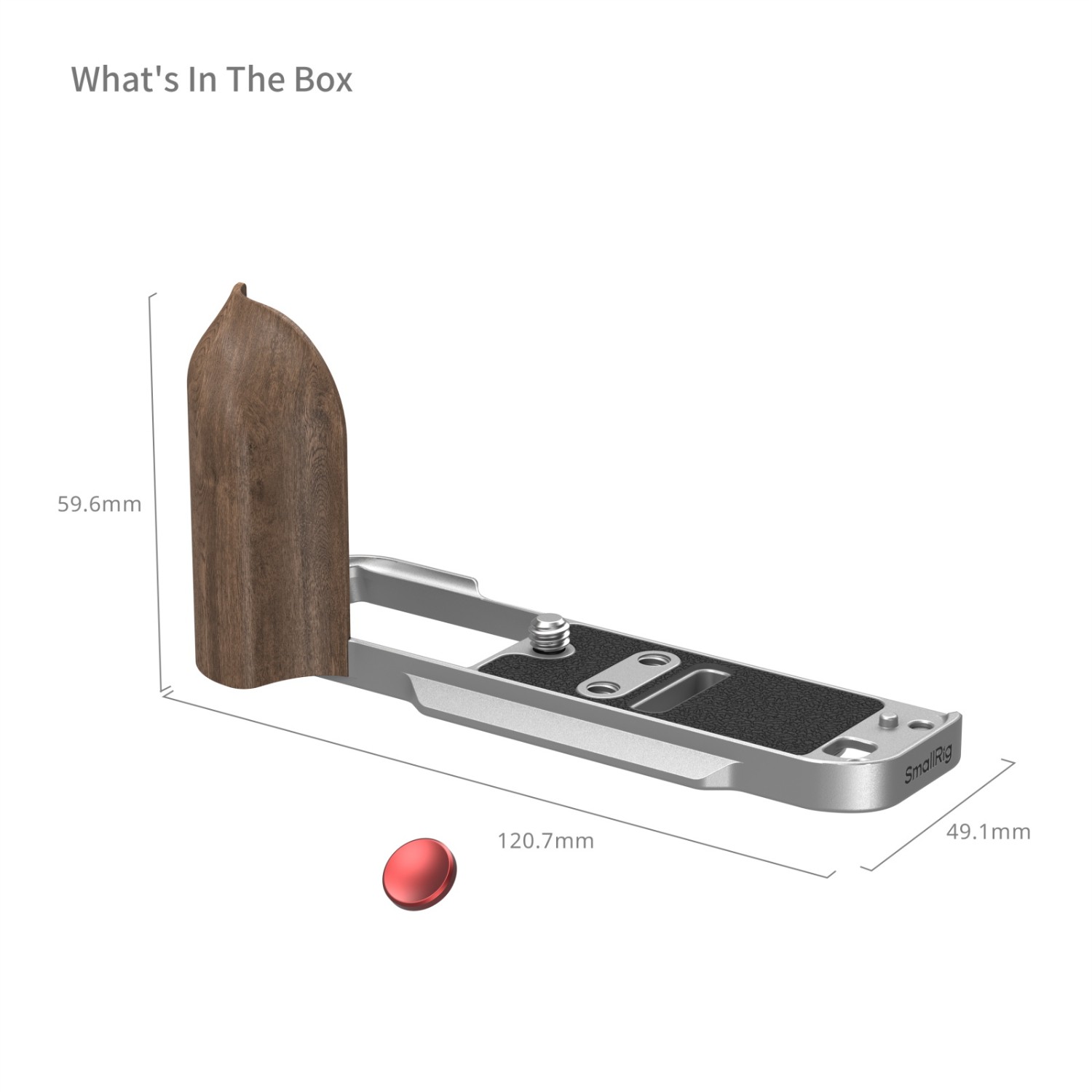 Malá L-tvarová montážna doska SmallRig s drevenou rukoväťou pre FUJIFILM X-T30 / X-T30 II / X-T30 III (strieborná) 5667 je navrhnutá tak, aby zvýšila pohodlie a stabilitu uchopenia pre lepšiu kontrolu pri fotografovaní. Bezpečne sa pripája k fotoaparátu pomocou skrutky 1/4"-20 v spodnej časti a je vybavená integrovanými silikónovými podložkami, ktoré chránia pred poškriabaním. L-tvarovaná rukoväť je vyrobená z masívneho dreva a nielenže dodáva fotoaparátu príjemnú, prirodzenú textúru, ale aj diskrétny retro šarm.
