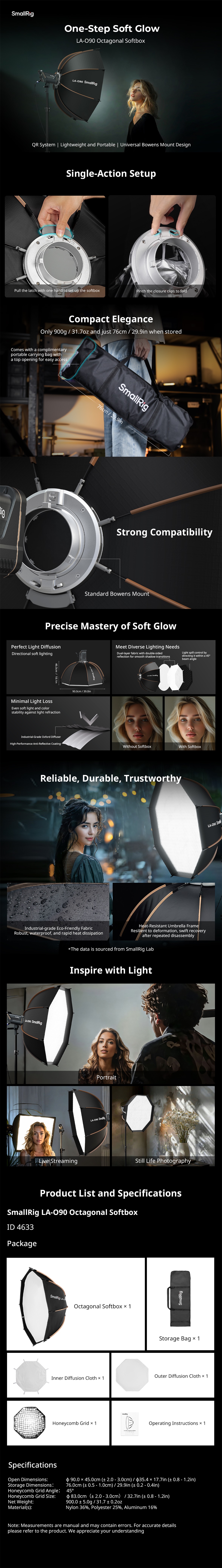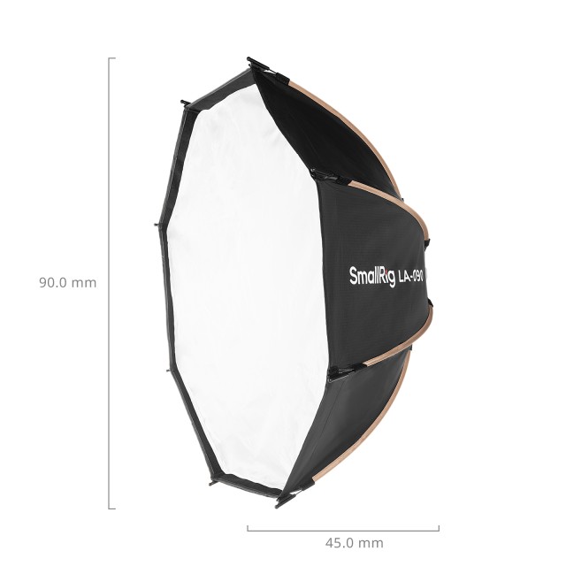 SmallRig LA-O90 Octagonal Softbox 4633 je univerzálny osemhranný softbox s priemerom 90 cm / 39,0 palcov určený na viacúčelové použitie. Rozhranie má univerzálnu konštrukciu s držiakom Bowens, kompatibilnú so zariadeniami SmallRig RC 120D / RC 120B / RC 220D / RC 220B / RC 350D / RC 350B / RC 450D / RC 450B, ako aj s inými značkami, ktoré používajú držiak Bowens pre bodové zdroje svetla. Vďaka využitiu rýchloupínacej konštrukcie najnovšej generácie možno inštaláciu a demontáž vykonať jediným kliknutím, čo zjednodušuje používateľský zážitok a poskytuje vám najlepšiu použiteľnosť. Dodáva sa so 45° voštinovou mriežkou na účinné riadenie šírenia svetla, ktorá je vhodná pre širší rozsah scenárov. Osemuholníkový softbox LA-O90, ktorý využíva priemyselné materiály na mäkké svetlo a vysokoreflexné povlaky, sa štandardne dodáva s dvoma difúzormi na mäkké svetlo na dosiahnutie najlepšieho svetelného efektu, čím vyhovie rôznym vašim potrebám.