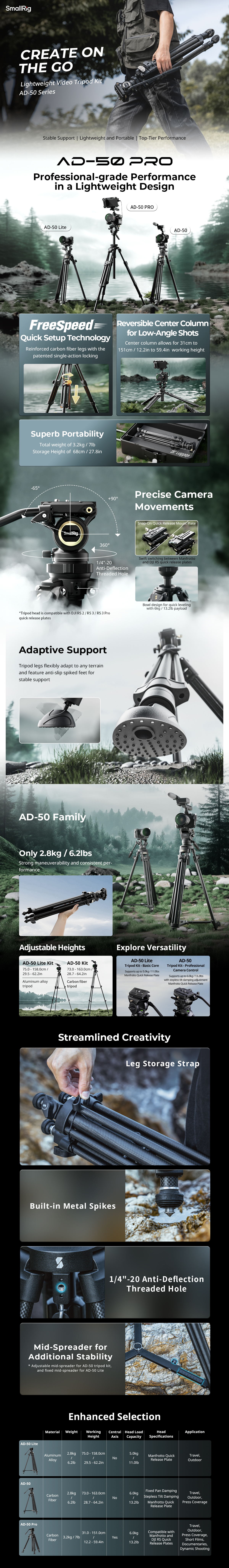 Súprava ľahkého videostatívu SmallRig z uhlíkových vlákien AD-50 Pro 4420 je určená na profesionálnu outdoorovú videografiu. Je vybavený technológiou FreeSpeed, ktorá využíva systém uzamykania v jednom kroku - ovládaním jediného prepínača možno rýchlo uzamknúť dve časti nôh. Konštrukcia z uhlíkových vlákien, nohy aj stredový stĺpik zabezpečujú ľahkú konštrukciu a zároveň poskytujú výnimočnú stabilitu a vysokú nosnosť. Prevádzková výška sa pohybuje od 31 cm (12,2 palca) do 151 cm (59,4 palca) a kompaktná skladovacia dĺžka je 68 cm (26,8 palca). Stredový stĺp je vybavený integrovanou miskovou základňou, ktorá umožňuje nastavenie na rýchle vyrovnanie, s odnímateľným imbusovým kľúčom zabudovaným do videohlavy na pohodlnú montáž/demontáž kamerového zariadenia a možnosťou snímania pod nízkym uhlom v minimálnej výške 31 cm (12,2 palca). Kompaktná konštrukcia statívu umožňuje, aby sa zmestil do každej štandardnej batožiny.