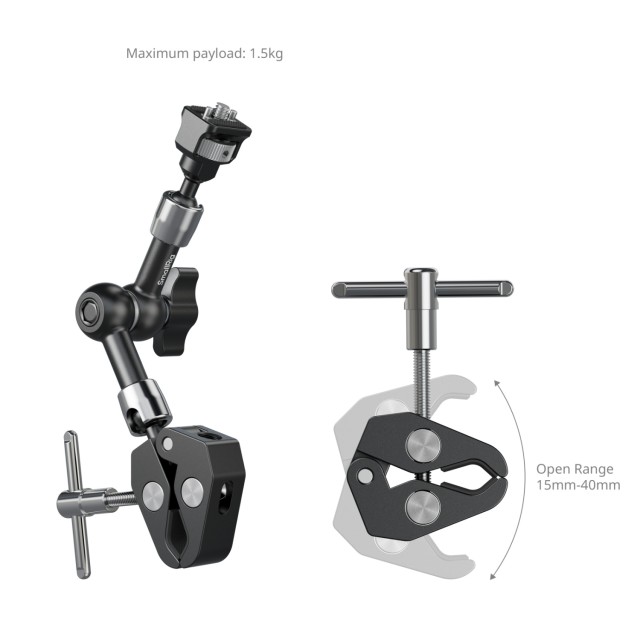 Svorka v tvare kraba obsahuje konštrukciu proti skrúteniu v mieste spojenia s magickým ramenom, ktorá zabraňuje uvoľneniu alebo odpojeniu. Je vhodná pre trubky, stoly, nohy statívu alebo stabilizačné krúžky ručného stabilizátora s priemerom od 15 do 40 mm (0,6 až 1,6 palca) a má zabudované podložky na zvýšenie stability a ochrany.