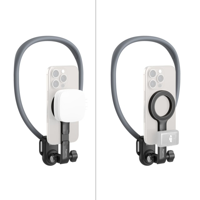 Držiak na krk je vybavený univerzálnym 2-kolíkovým držiakom pre akčné kamery a magnetickým držiakom telefónu na okamžité pripevnenie iPhonu. Držiak telefónu je vybavený 17 silnými magnetmi N52 na bezpečné uchytenie spolu s dodatočným magnetickým adaptérovým krúžkom pre zariadenia so systémom Android a iné zariadenia ako MagSafe. Ak sa nepoužíva pre smartfóny, na držiak na krk možno priamo umiestniť akčné kamery.