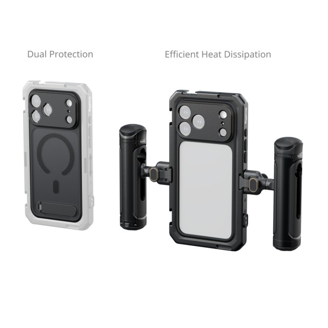 SmallRig Mobile Dual Handheld Kit pre iPhone 17 Pro Max 5541 je profesionálne riešenie pre dvojité ručné snímanie určené špeciálne pre iPhone 17 Pro Max, ktoré uľahčuje profesionálne nahrávanie videa, živé vysielanie a produkciu krátkych filmov. Táto komplexná sada obsahuje puzdro na telefón, videoklietku, otočnú bočnú rukoväť s bezdrôtovým ovládaním, otočnú bočnú rukoväť a mäkký nárazník z TPU.