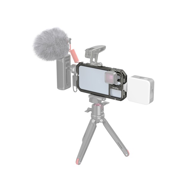 SmallRig Mobile Video Cage 3561 je multifunkčná špeciálna klietka navrhnutá pre iPhone 13 Pro Max na profesionálnu videografiu, živé vysielanie a vlogovanie. Kompaktná, váži len 95 g a je vybavená otvormi so závitom 1/4"-20 proti skrúteniu a cold shoes, ktoré podporujú príslušenstvo ako bočná rukoväť 2772, statív BUT2664, mikrofón 3452 a LED svetlo 3286. Jeho zadný kryt objektívu je vymeniteľný a kompatibilný s objektívmi so závitom M alebo 17 mm pre lepšiu kvalitu obrazu. Neblokuje tlačidlá, porty iPhonu a umožňuje používať radar, ultraširokouhlé objektívy a bezdrôtové nabíjanie. Vďaka konštrukcii s rýchlym uzamknutím sa klietka ľahšie skladá a rozkladá, je bezpečnejšia a stabilnejšia, po uzamknutí nevyskočí v dôsledku náhodného dotyku. Kovovo vyrobená plná klietka spolu so zabudovanými podložkami chráni smartfón a zabraňuje vibráciám a poškriabaniu. Klietka umožňuje horizontálne a vertikálne snímanie.