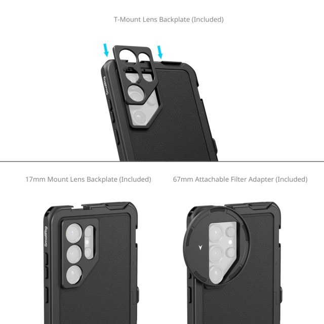 Boky sú vybavené dvoma sadami otvorov na zápästie a ramenný popruh, kompatibilnými s profesionálnymi popruhmi s priemerom menším ako 2 mm (0,07 palca), čo zvyšuje prenosnosť počas prestávok v snímaní. Dutý výrez poskytuje voľný prístup k tlačidlám telefónu, portom, stylusu, peru, radaru, ultraširokouhlým objektívom a bezdrôtovému nabíjaniu. Mechanizmus rýchleho uzamknutia umožňuje rýchlu a bezpečnú inštaláciu a vybratie telefónu, čím zabraňuje náhodnému vysunutiu. Jeho celokovová konštrukcia poskytuje komplexnú ochranu, absorbuje nárazy a zabraňuje poškriabaniu.