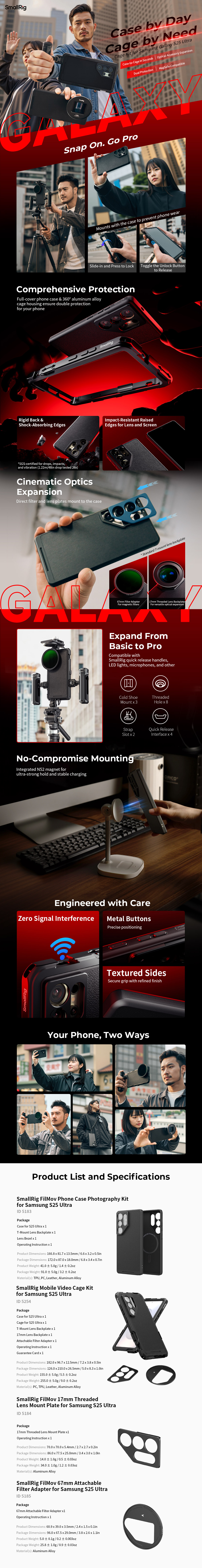 Súprava SmallRig Mobile Video Cage Kit pre Samsung S25 Ultra 5254 je všestranné riešenie určené na natáčanie na profesionálnej úrovni, živé vysielanie a produkciu krátkych filmov so zariadením Samsung S25 Ultra. Súprava obsahuje ochranné puzdro na telefón, klietku na video, špeciálnu zadnú dosku T-mount, zadnú dosku na 17 mm objektív a zadnú dosku s magnetickým filtrom. Puzdro na telefón poskytuje každodennú ochranu a možno ho spárovať buď s T-mount alebo 17mm backplate na upevnenie externých objektívov, alebo s magnetickým backplate na 67mm magnetické filtre, čím sa zabezpečí vysokokvalitná produkcia videa.