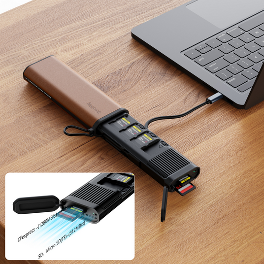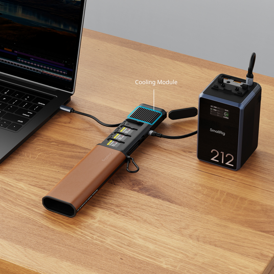Multifunkčná čítačka kariet a puzdro na uloženie SmallRig (CFexpress Type A) 5361 – vysokorýchlostná čítačka s tromi slotmi s prenosovou rýchlosťou 10 Gb/s, bezpečným úložiskom pre 10 kariet, aktívnym chladením a integrovaným sledovaním AirTag.