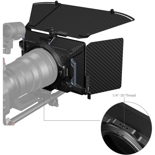 Tento základný balík obsahuje aj zásobník na filtre s rozmermi 4 x 5,65", krytku objektívu, hornú vlajku a dve bočné vlajky na ďalšie prispôsobenie jasnému slnečnému svetlu alebo výplňovému svetlu. Vďaka dvojitej 15 mm podpernej tyči je matný box kompatibilný so systémami podperných tyčí. Všetko príslušenstvo a matný box možno uložiť do úložnej tašky na prepravu na ďalšie snímanie.