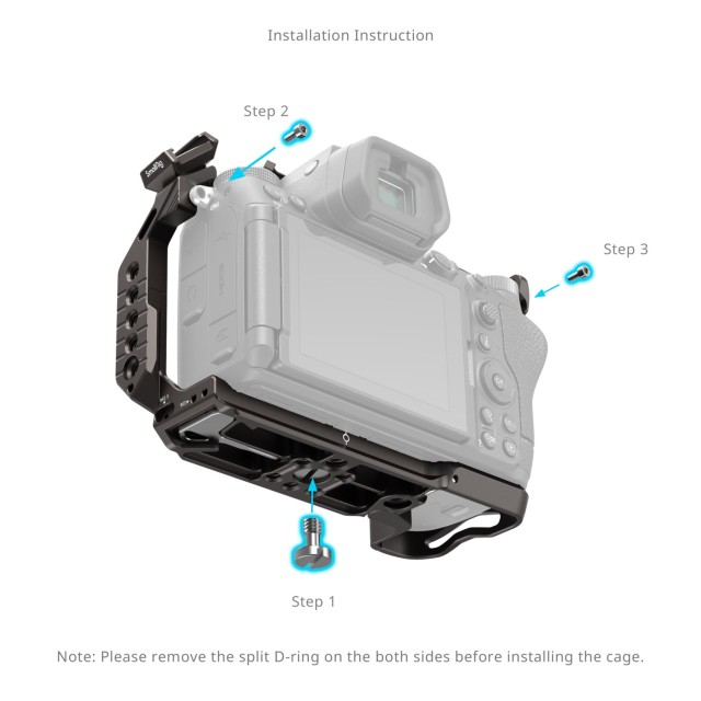 Poznámka : Pred inštaláciou tejto klietky odstráňte D-krúžky na bokoch fotoaparátu.